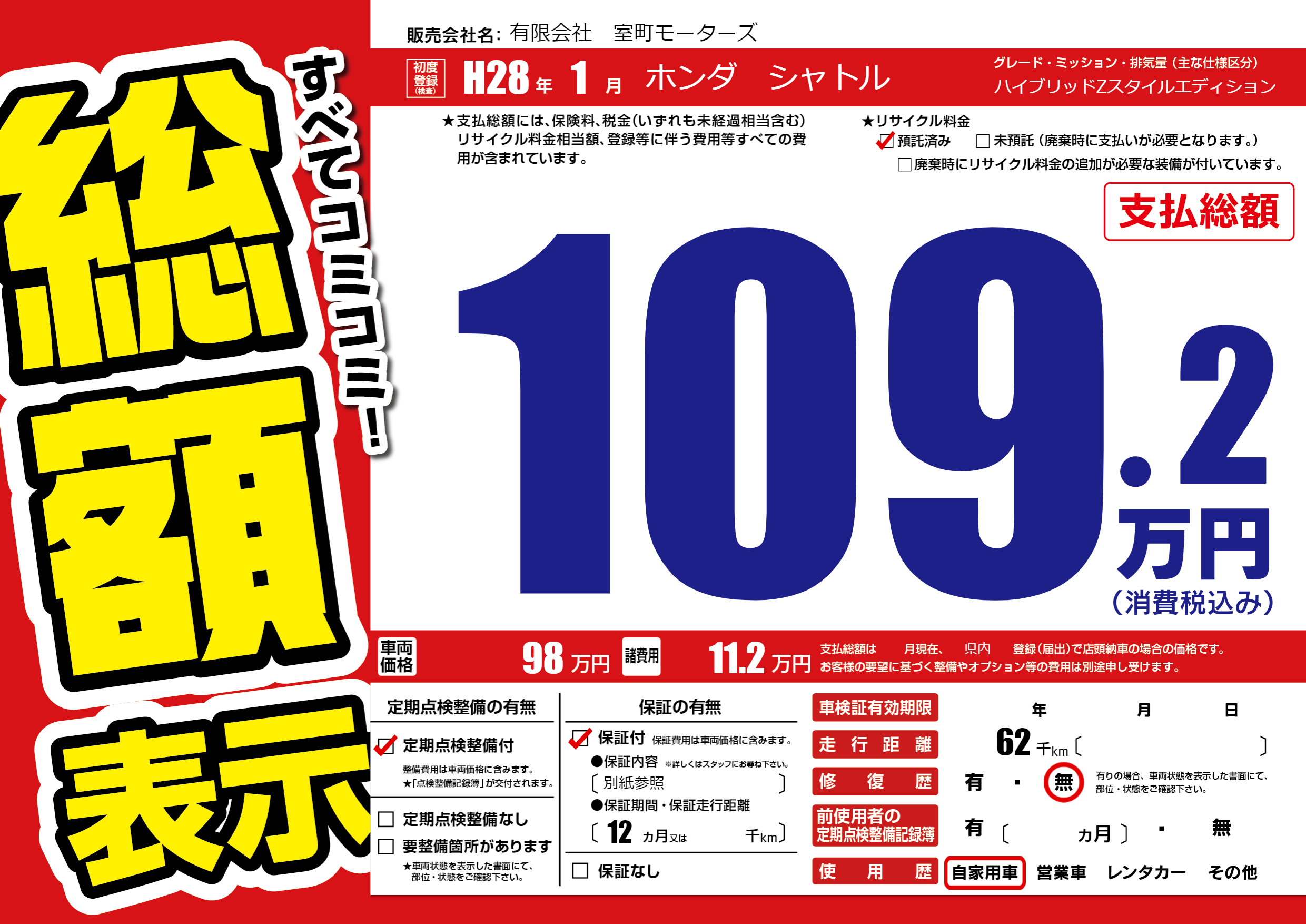 保証付き 保証内容(別紙参照) 12ヶ月または()千kmまで |