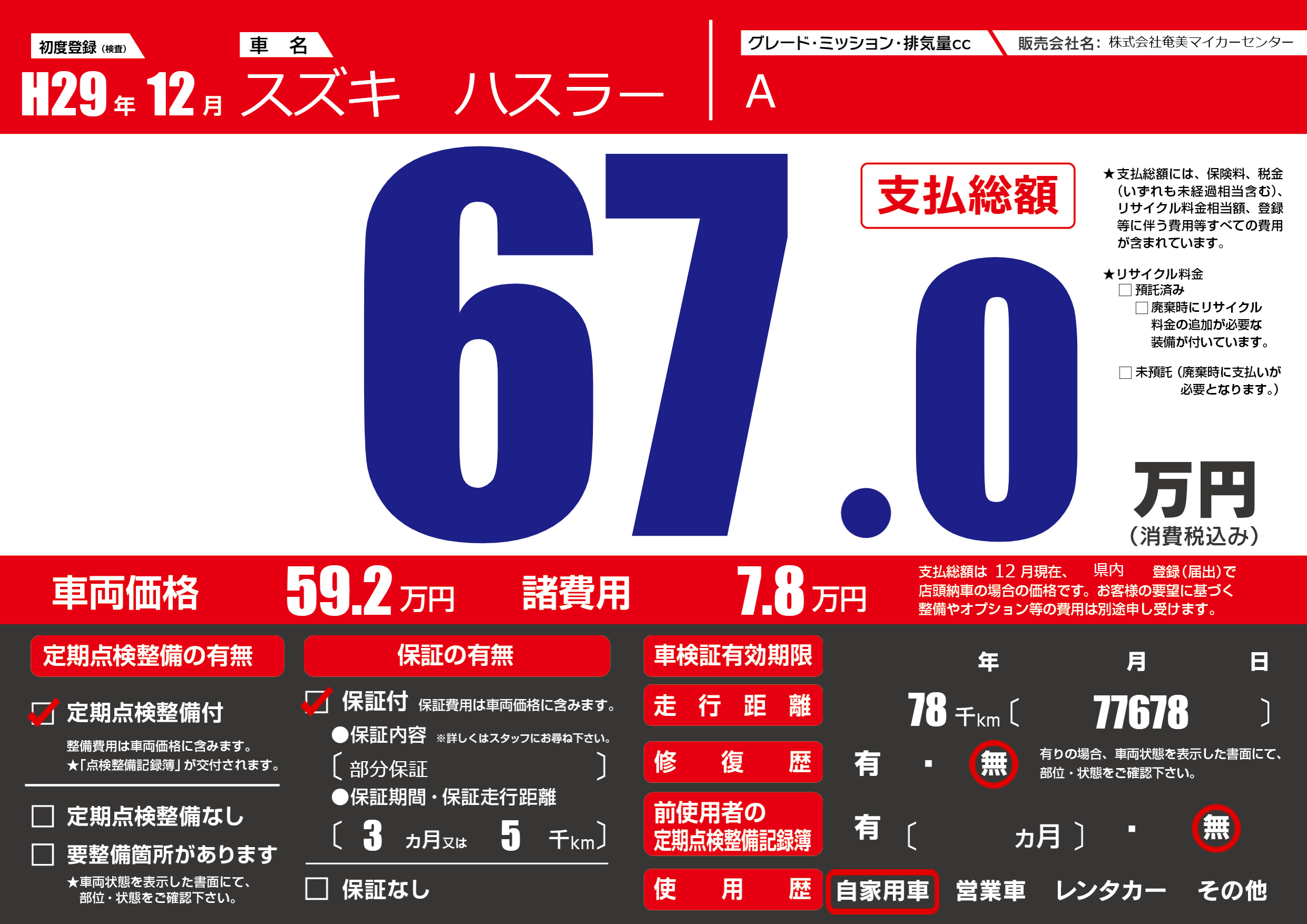 | 走行キロ | 7.8万km | 初年度登録 | H29年12月 |