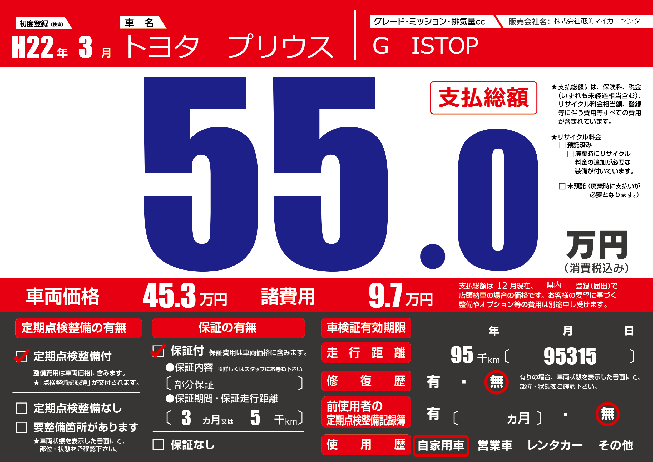 | 走行キロ | 9.5万km | 初年度登録 | H22年3月 |