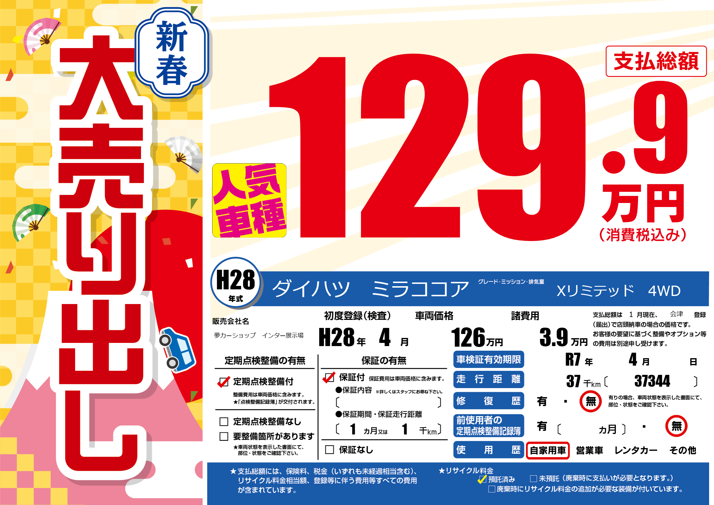 | 走行キロ | 3.7万km | 初年度登録 | H28年4月 |