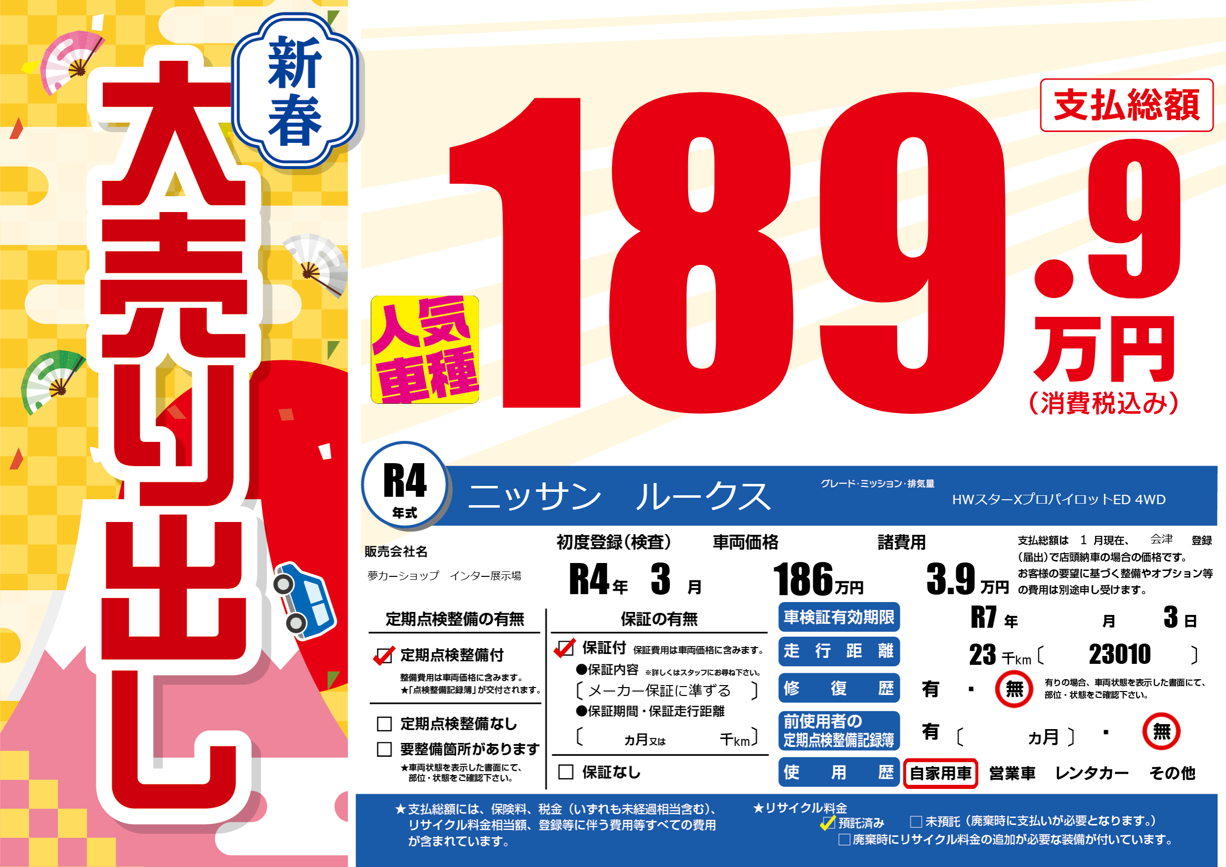| 走行キロ | 2.3万km | 初年度登録 | R4年3月 |