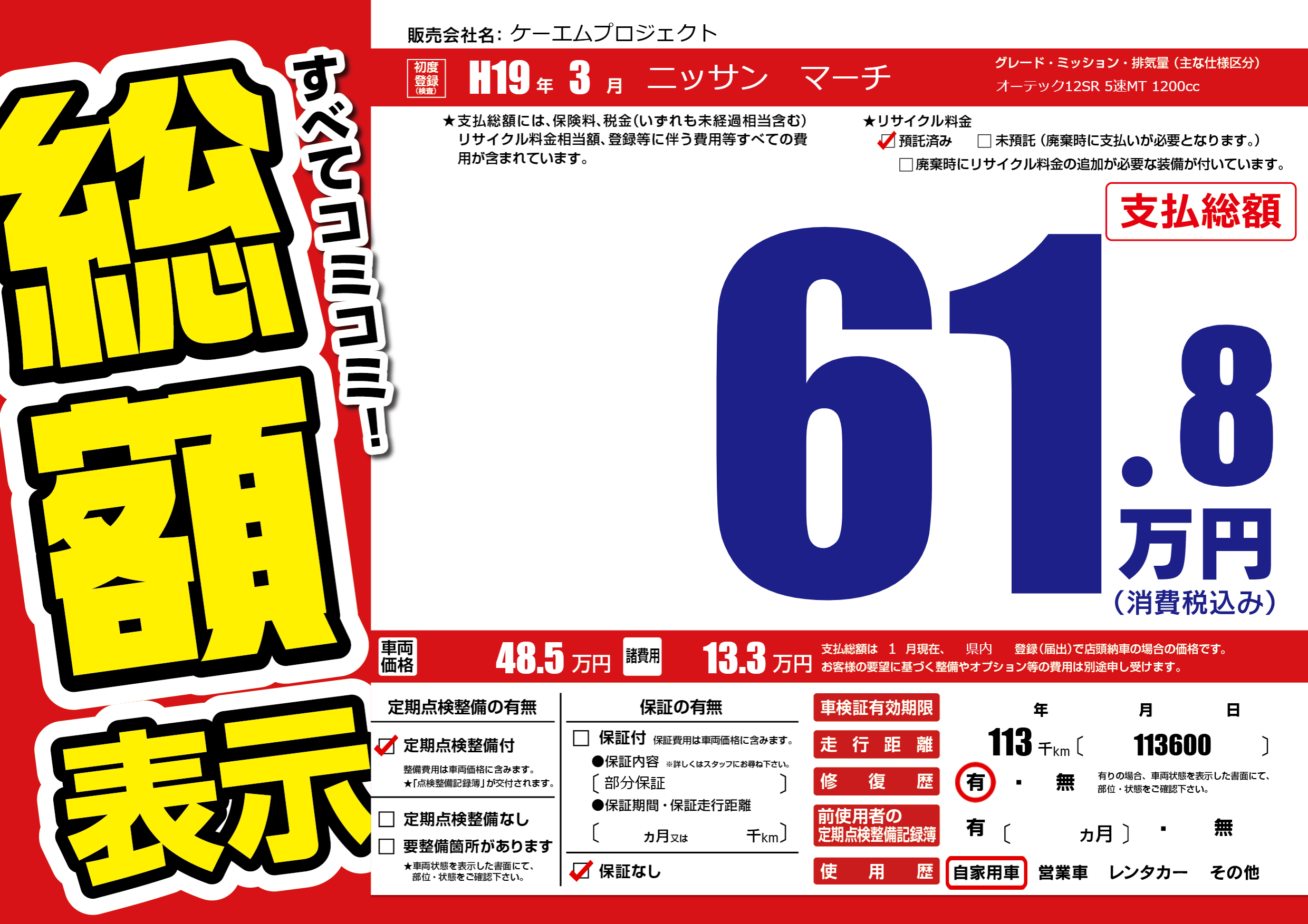 | 車名 | ニッサン マーチ | グレード ミッション 排気量 |
