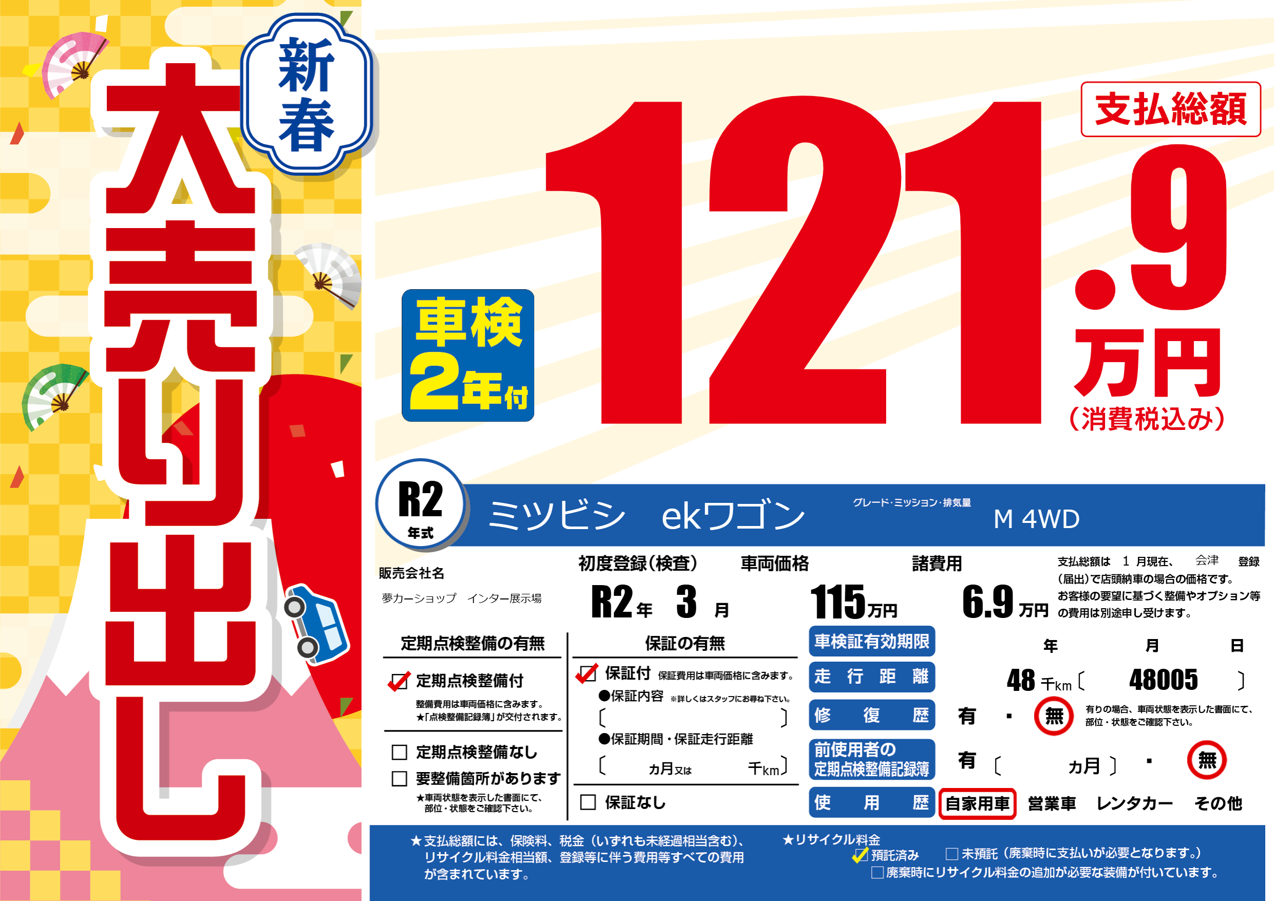 | 車名 | ミツビシ ekワゴン | グレード ミッション 排気量 |