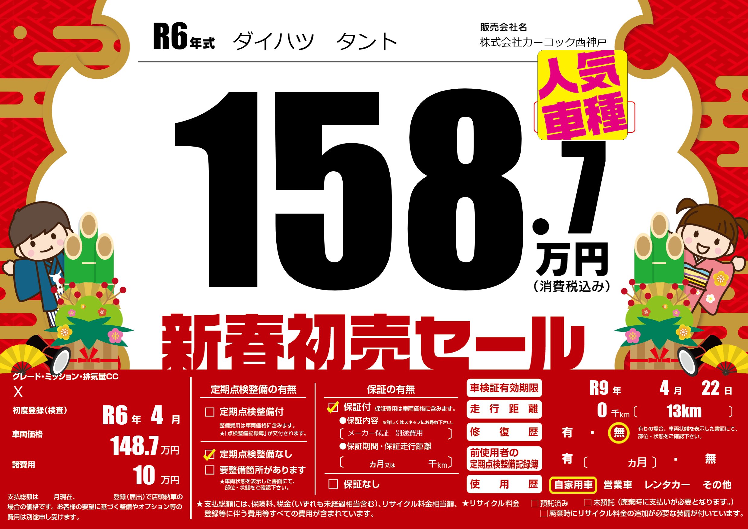 | 車名 | ダイハツ タント | グレード ミッション 排気量 |