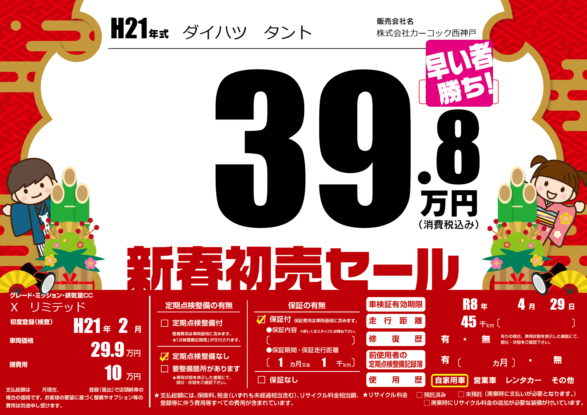 | 車名 | ダイハツ タント | グレード ミッション 排気量 |