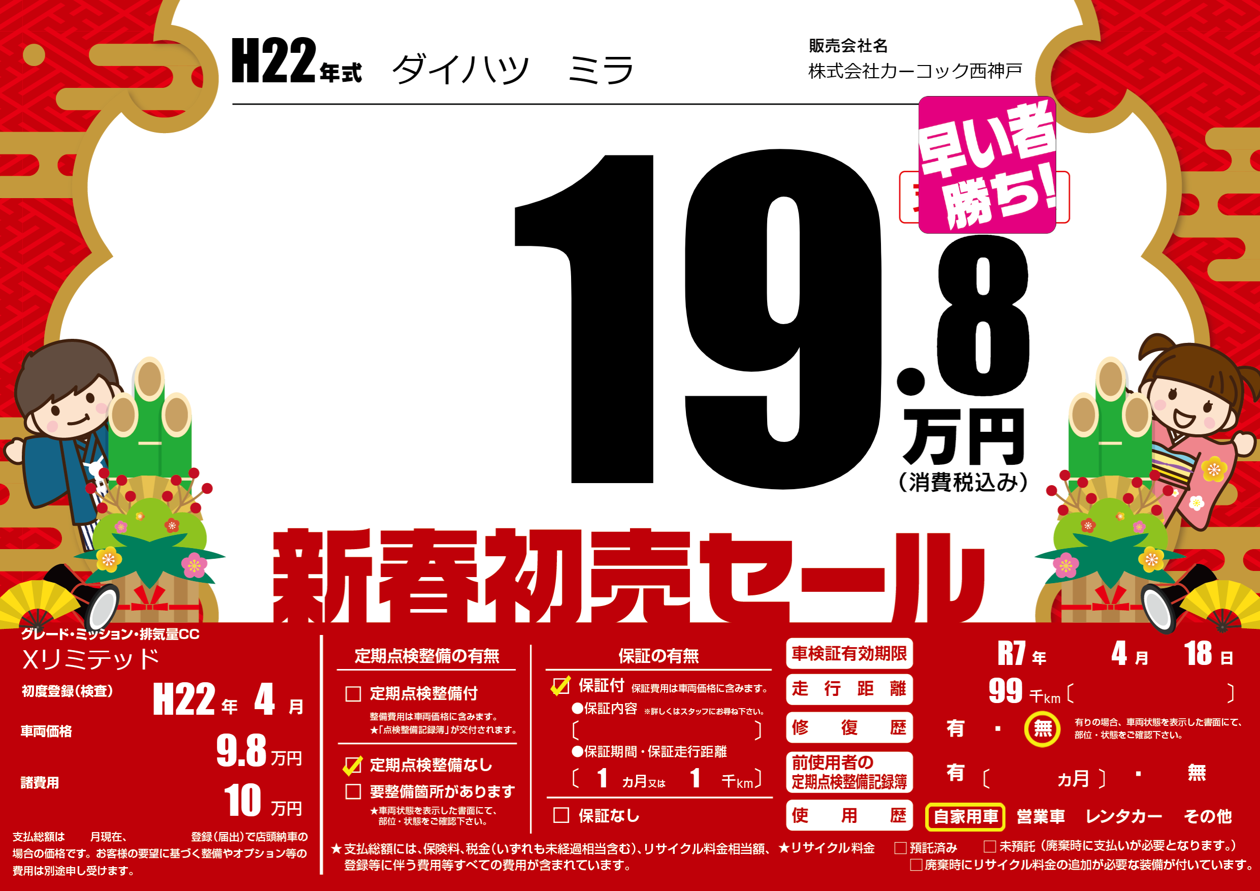 | 走行キロ | 9.9万km | 初年度登録 | H22年4月 |