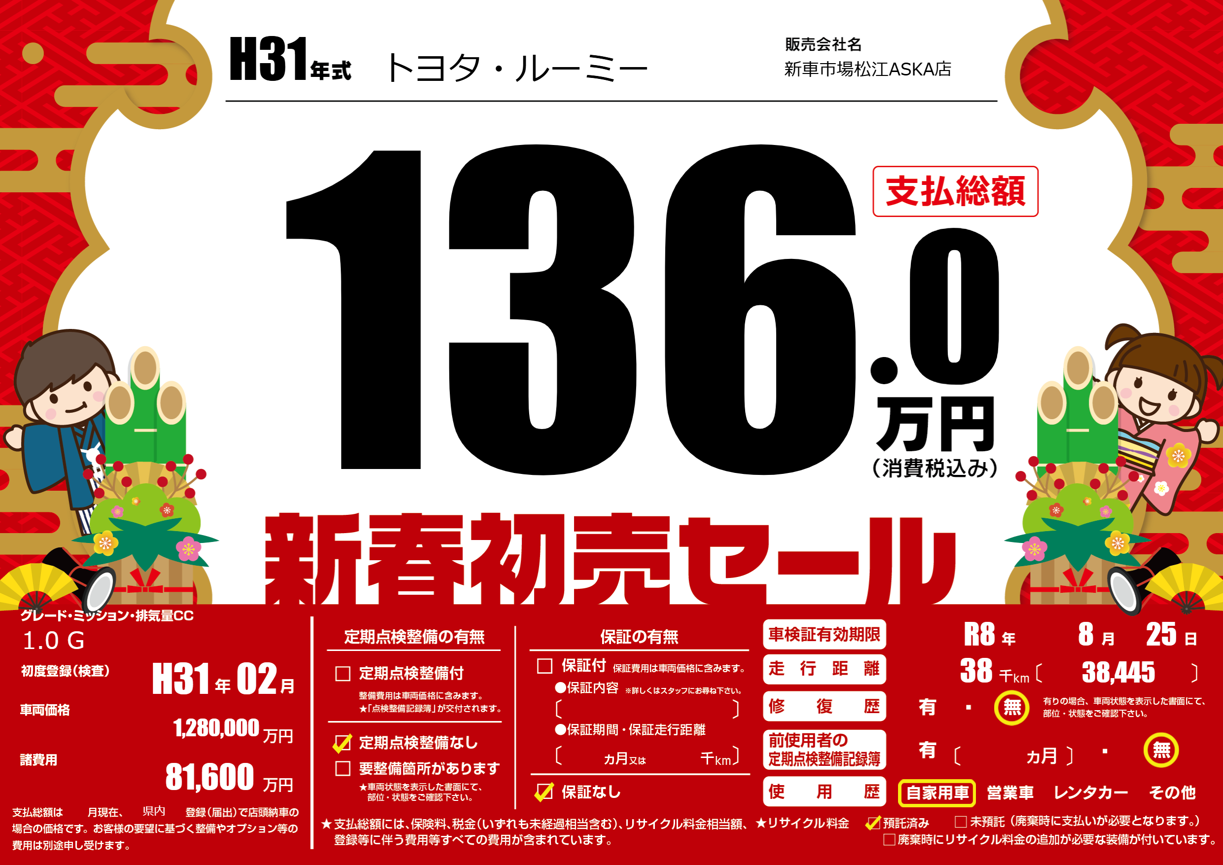 | 車名 | トヨタ・ルーミー | グレード ミッション 排気量 |