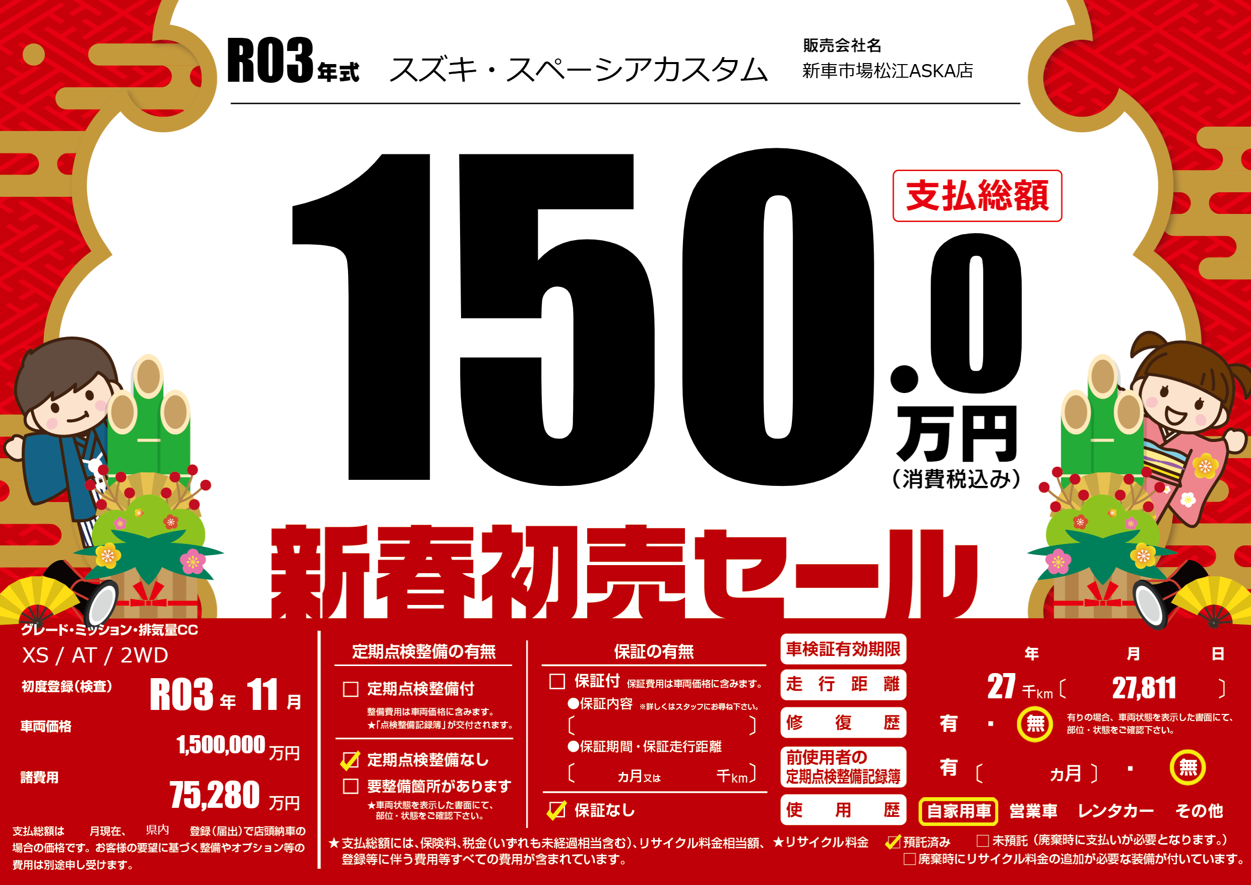 | 走行キロ | 2.7万km | 初年度登録 | R03年11月 |