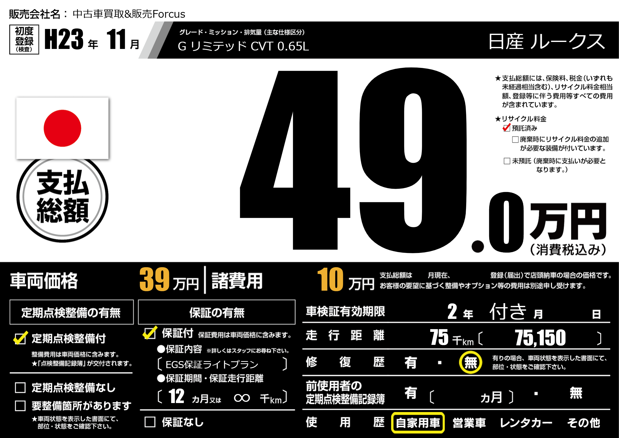 | 走行キロ | 7.5万km | 初年度登録 | H23年11月 |