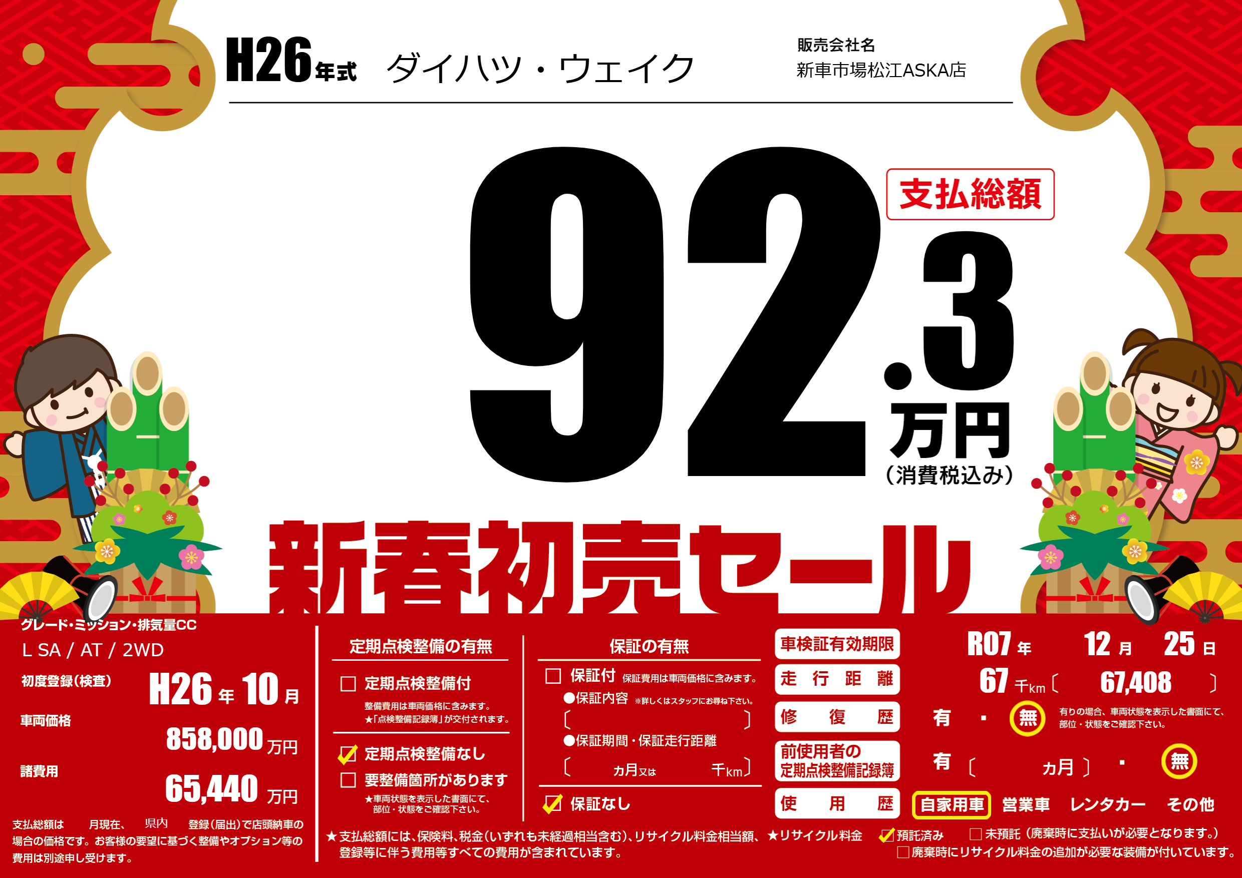 | 車名 | ダイハツ・ウェイク | グレード ミッション 排気量 |
