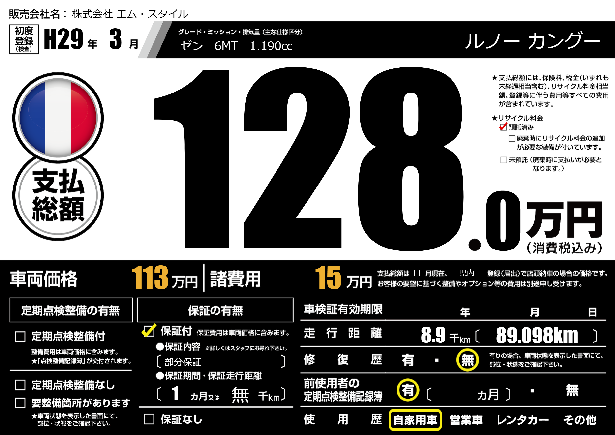 | 車名 | ルノー カングー | グレード ミッション 排気量 |