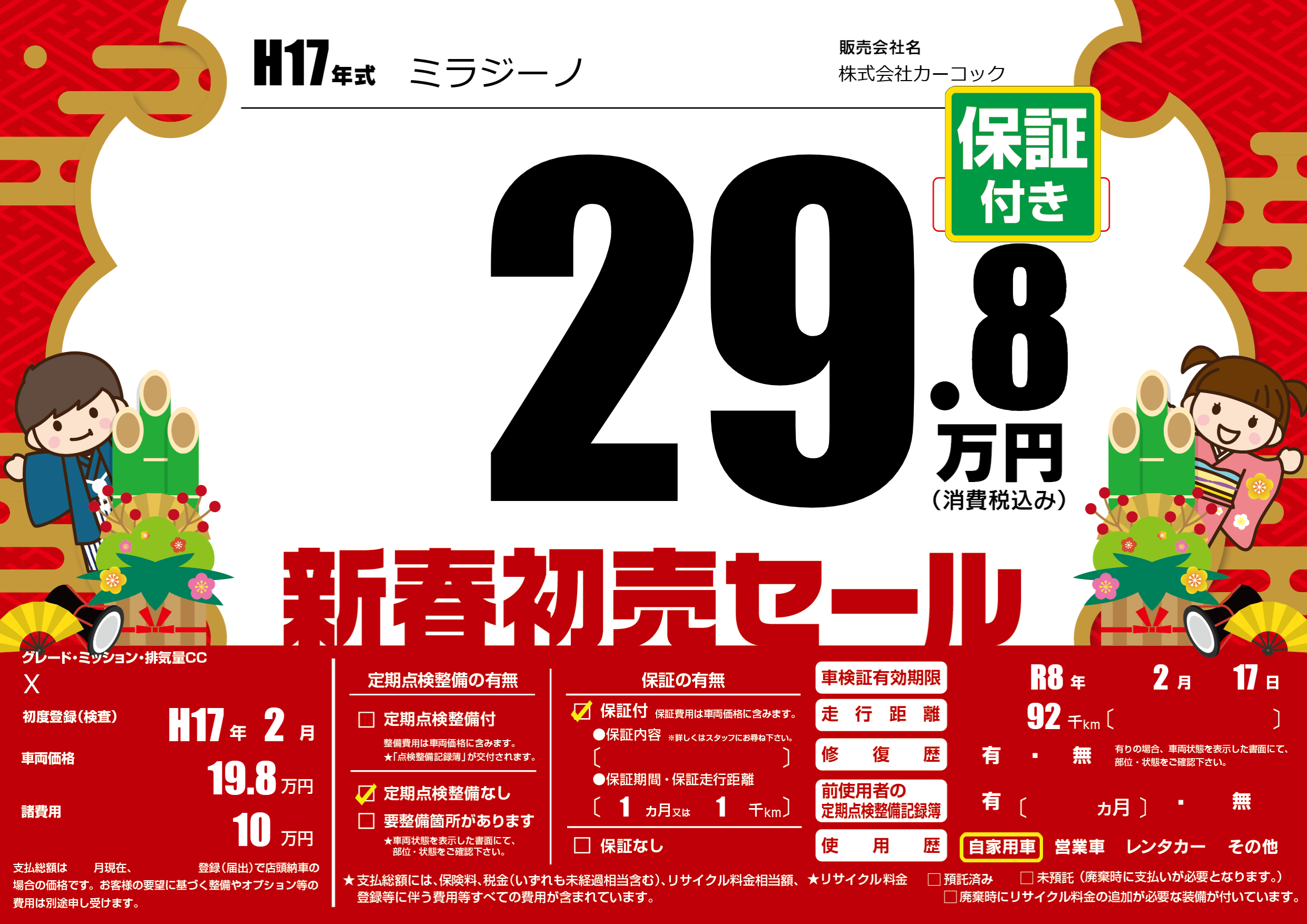 | 走行キロ | 9.2万km | 初年度登録 | H17年2月 |