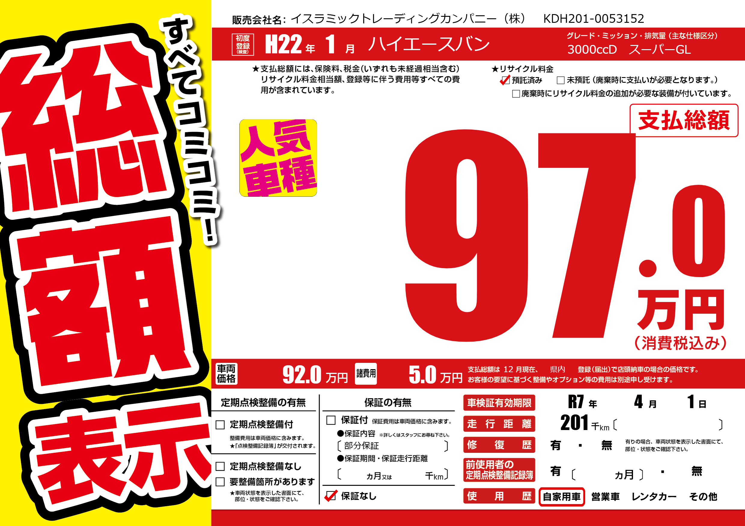 | 車名 | ハイエースバン | グレード ミッション 排気量 |