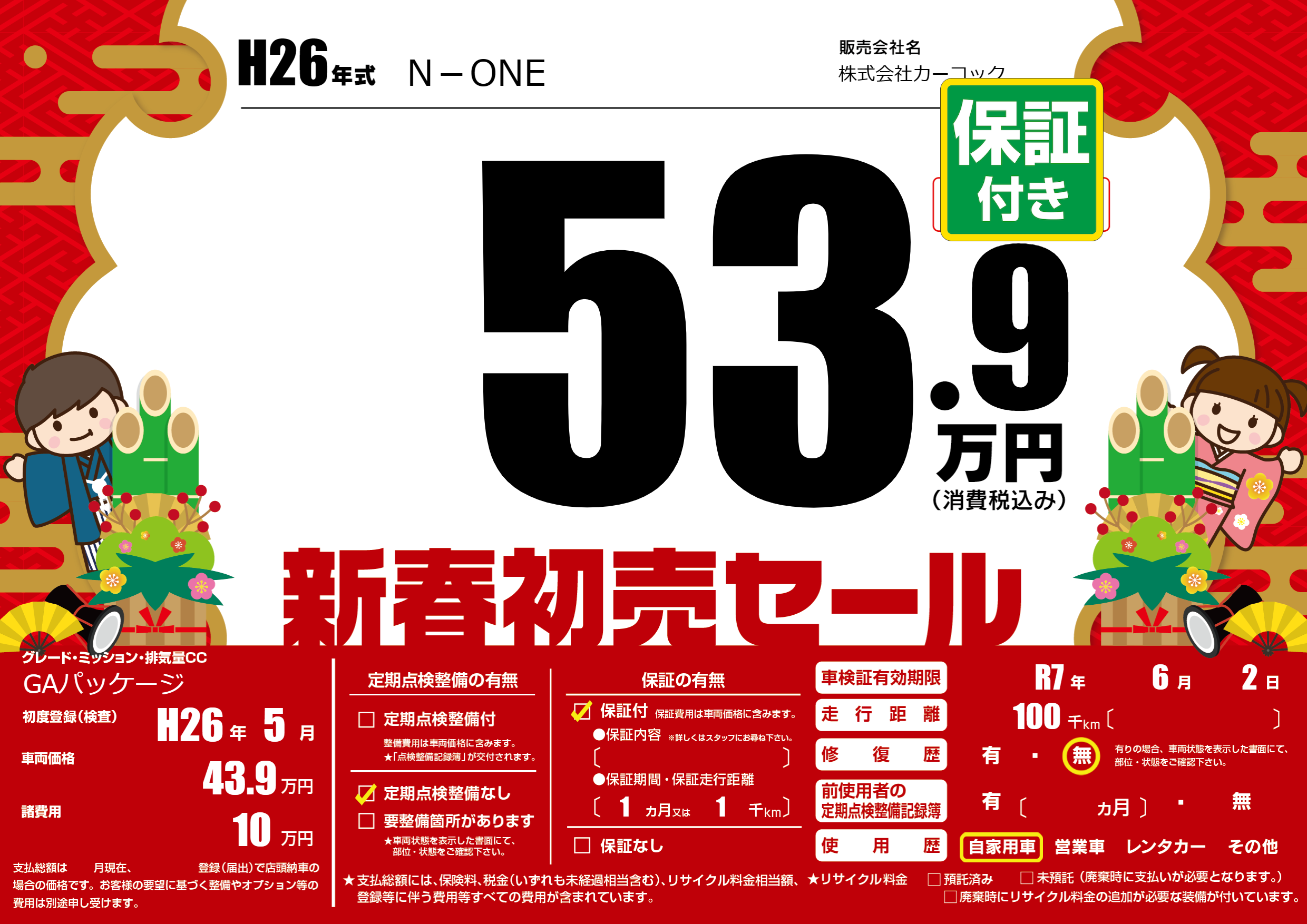 | 車名 | N-ONE | グレード ミッション 排気量 |