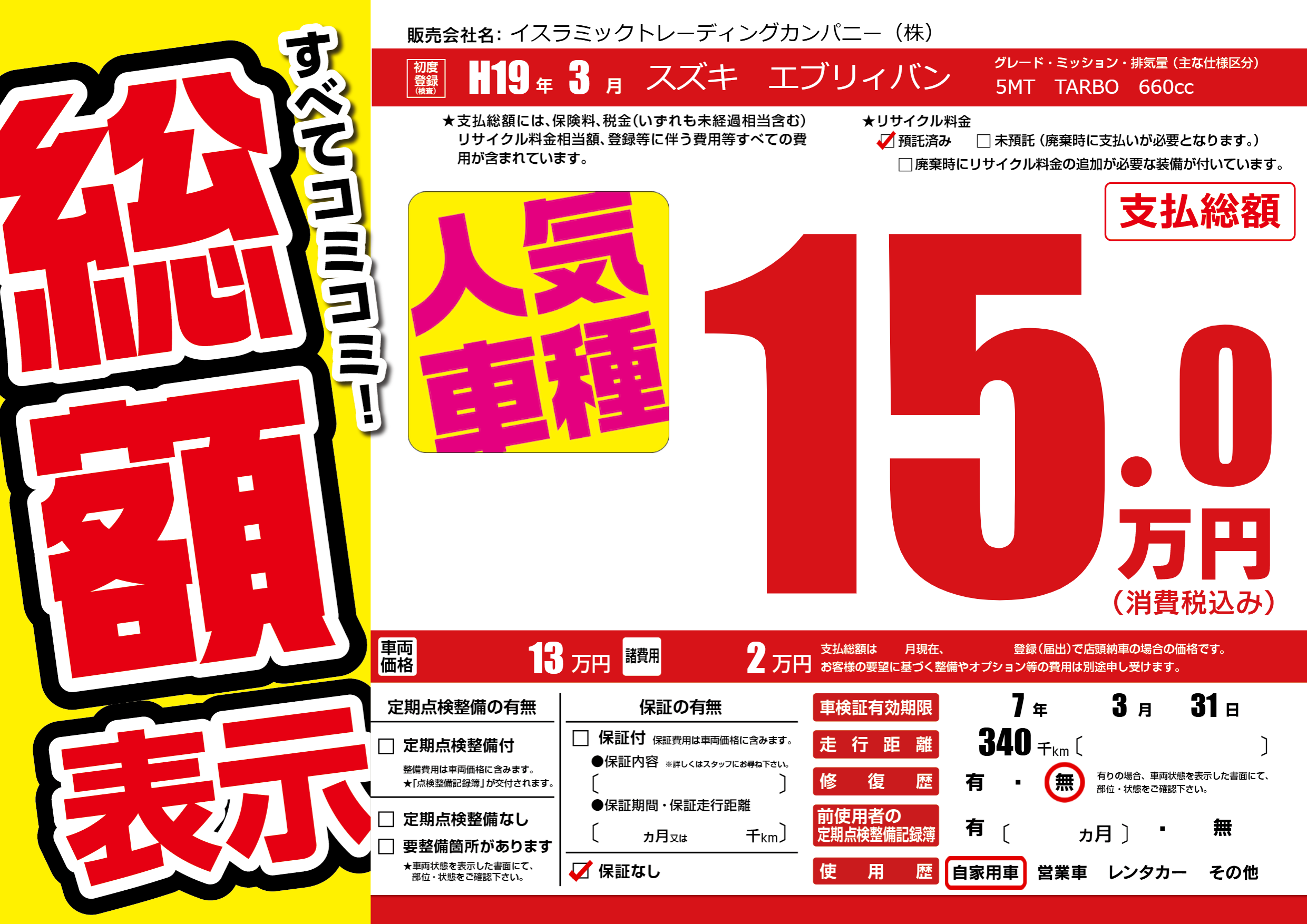 | 車名 | スズキ エブリィバン | グレード ミッション 排気量 |
