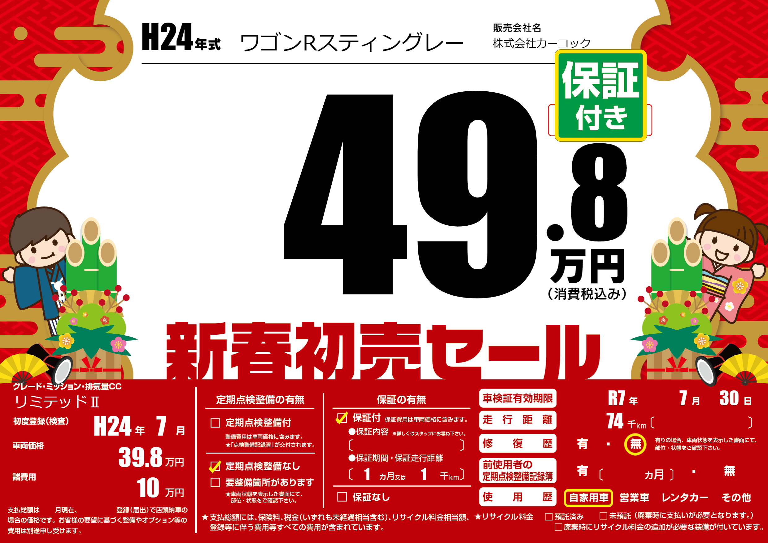 | 走行キロ | 7.4万km | 初年度登録 | H24年7月 |