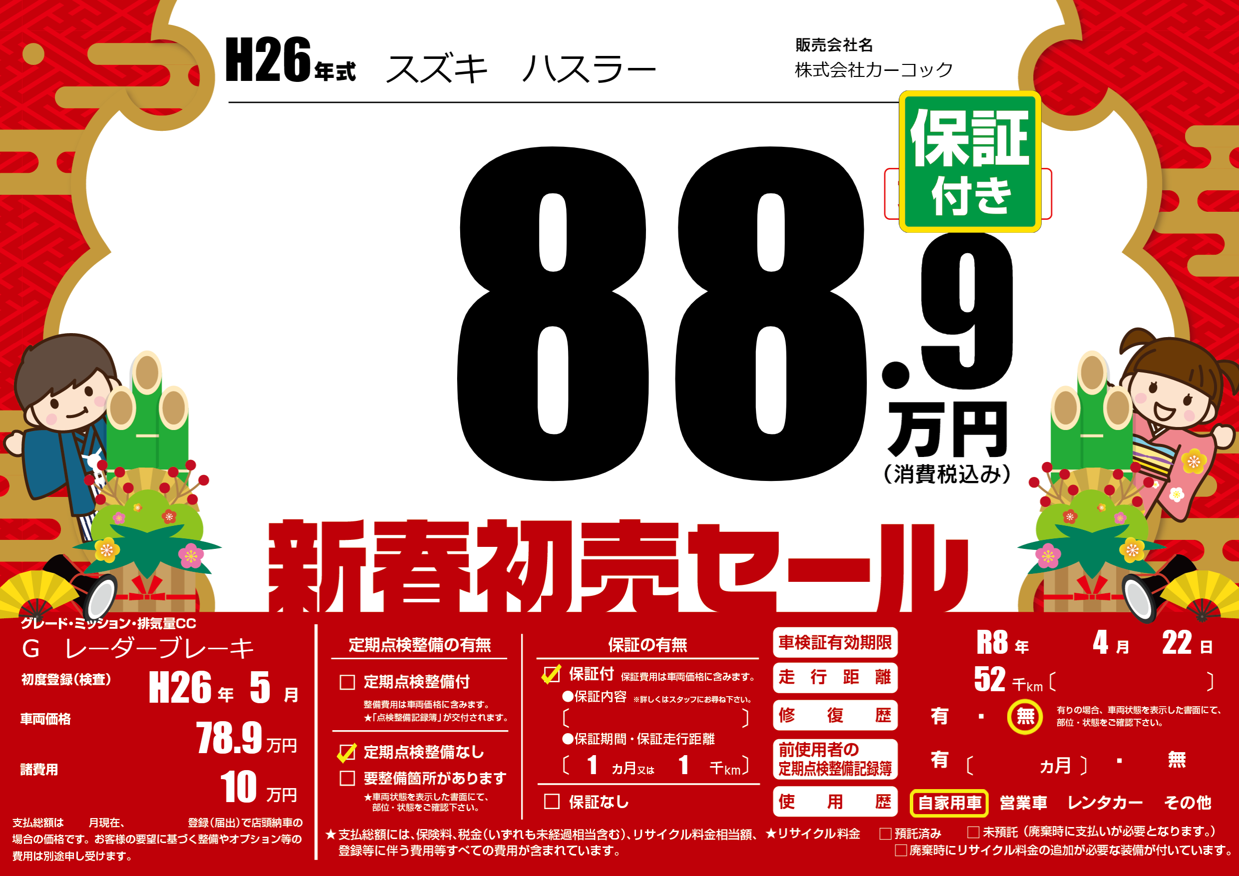 | 車名 | スズキ ハスラー | グレード ミッション 排気量 |