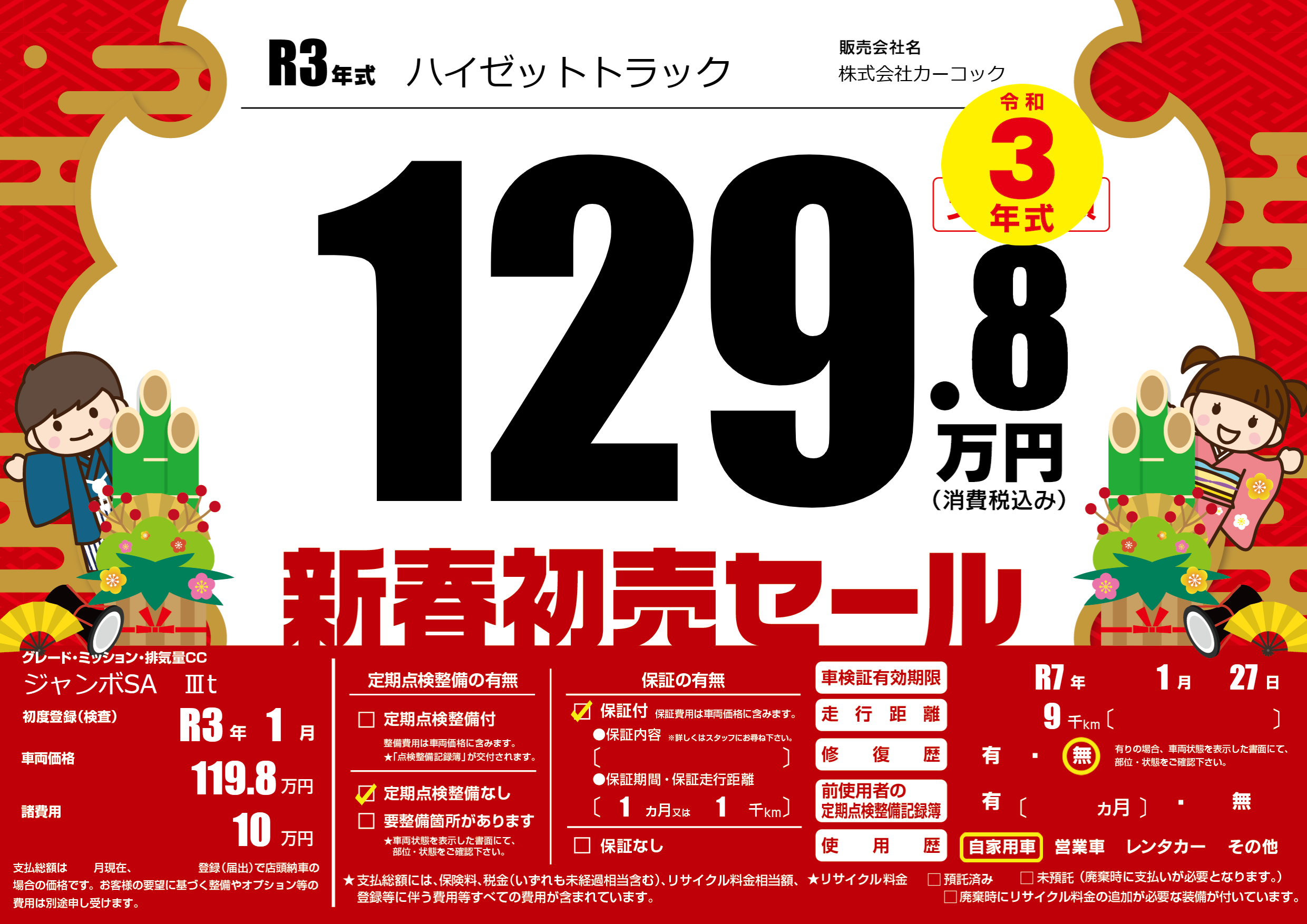 | 走行キロ | 0.9万km | 初年度登録 | R3年1月 |