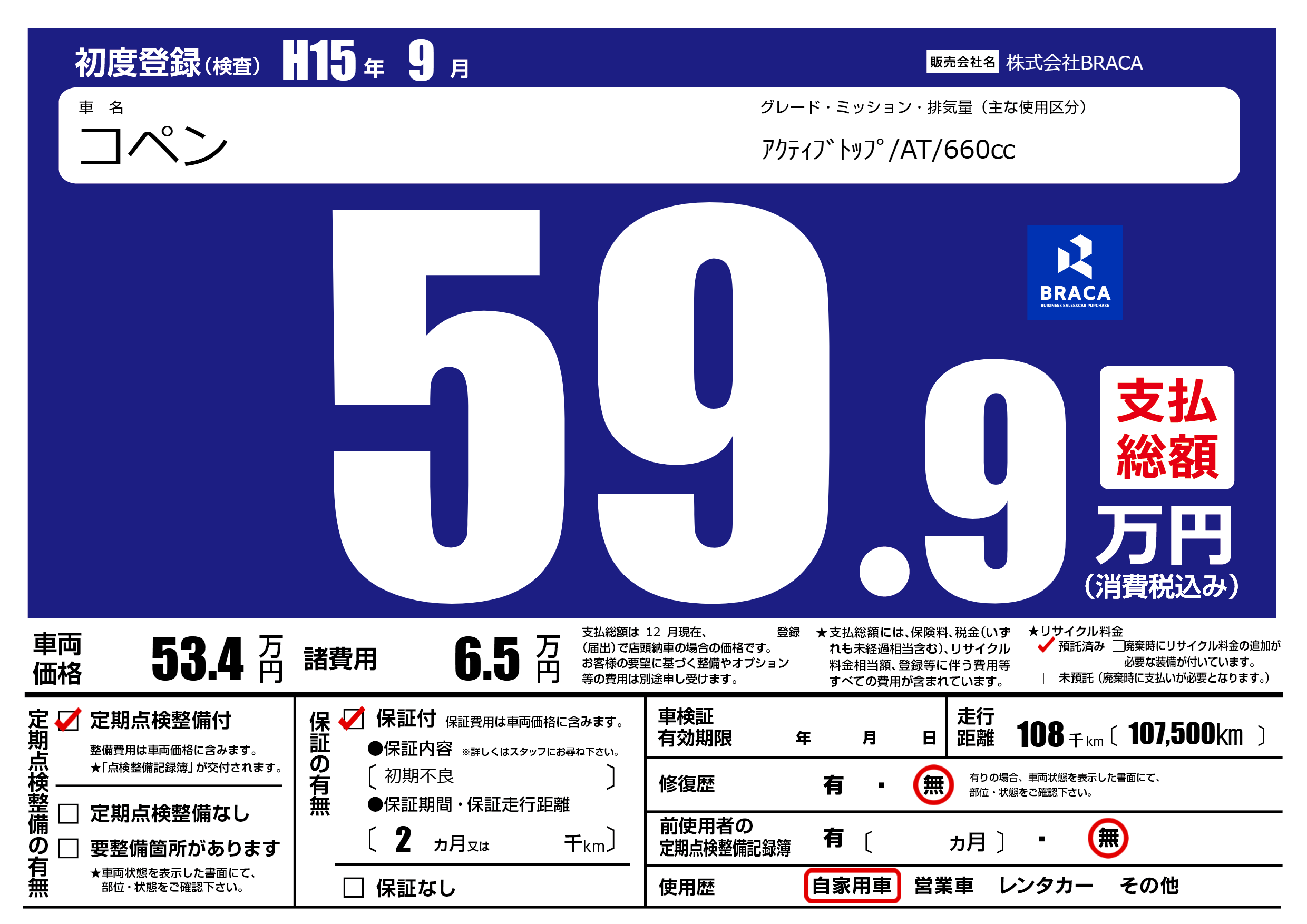 | 走行キロ | 10.8万km | 初年度登録 | H15年9月 |