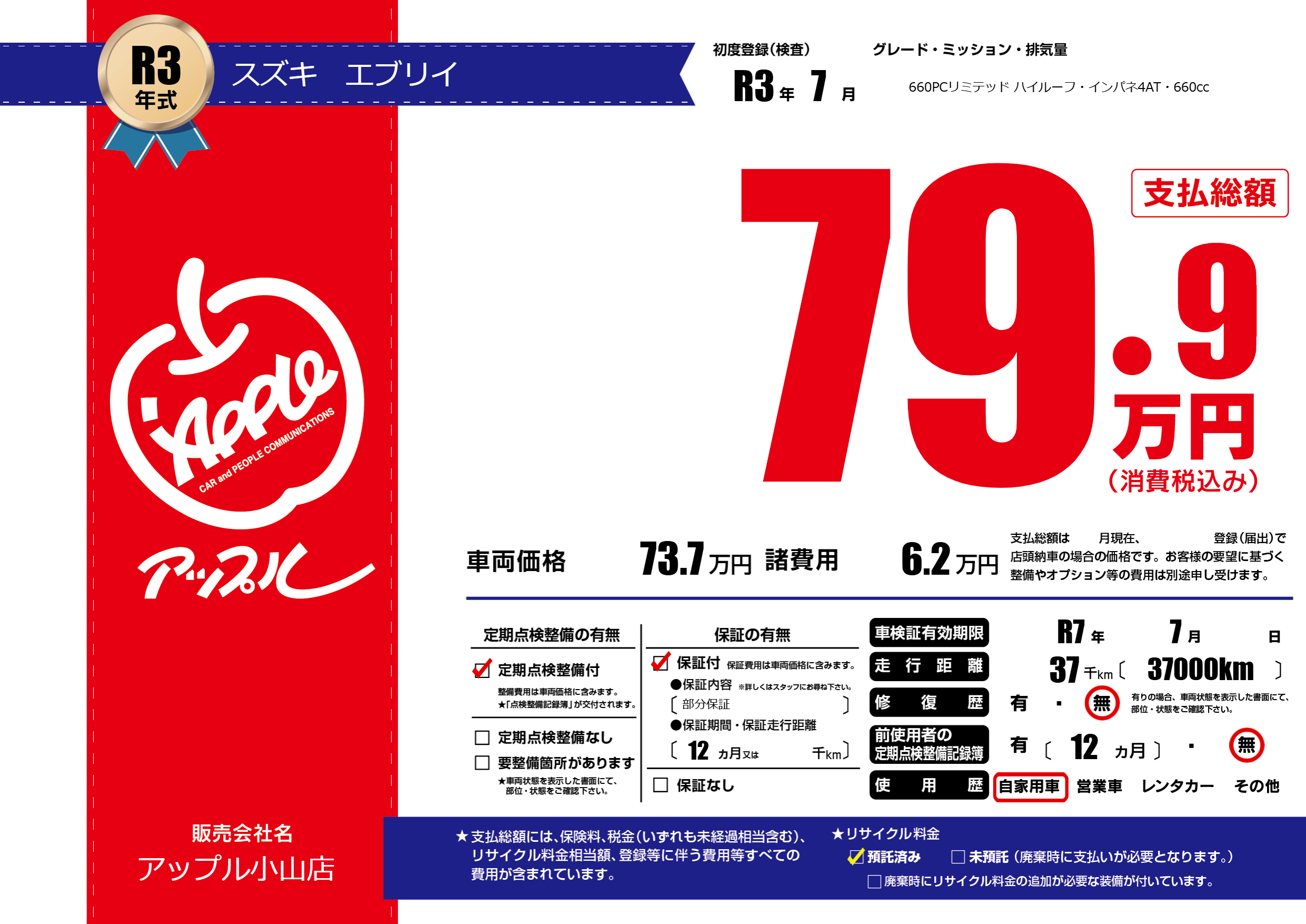 | 車検制限 | R7年 7月 - 日 | ||