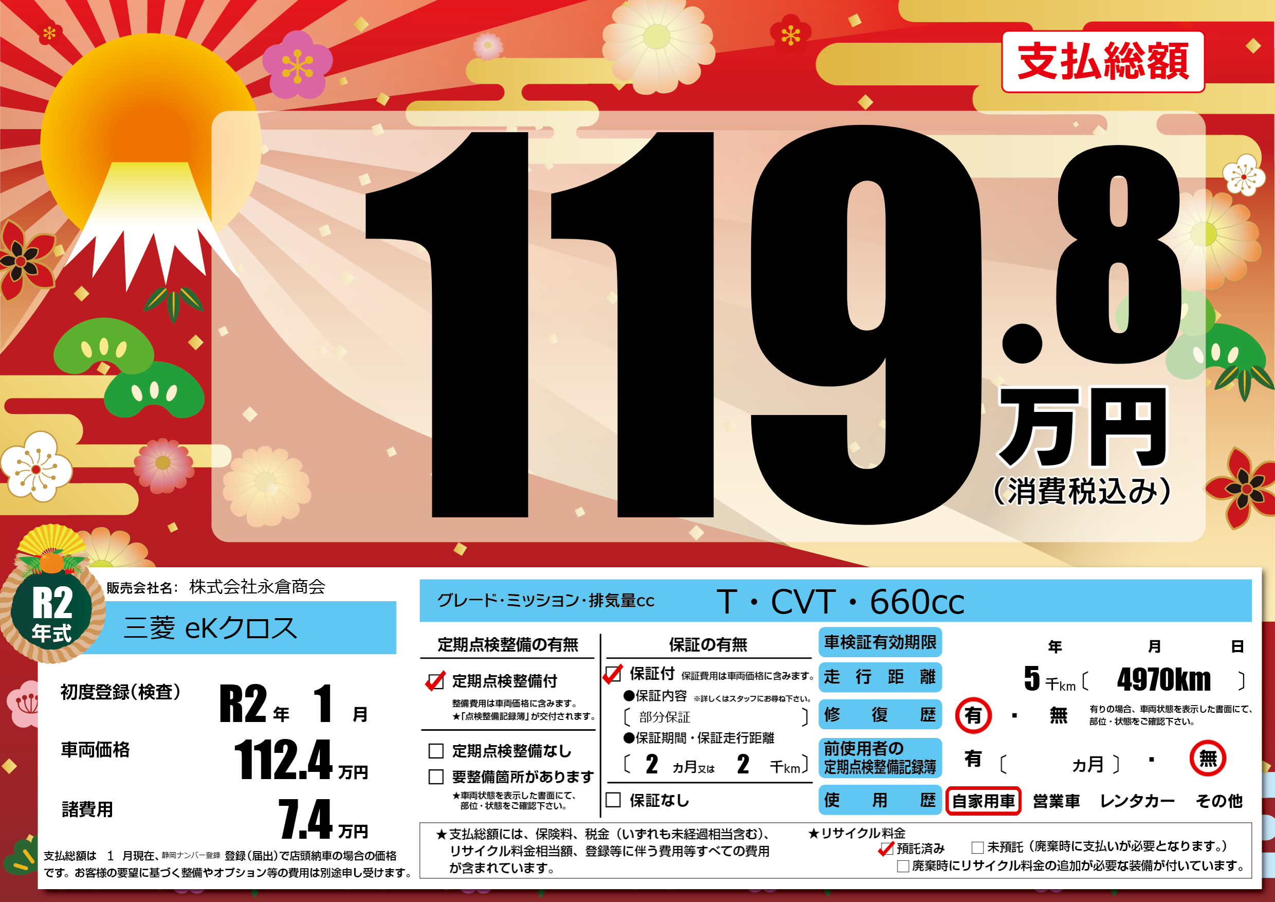 | 車名 | 三菱 eKクロス | グレード ミッション 排気量 |