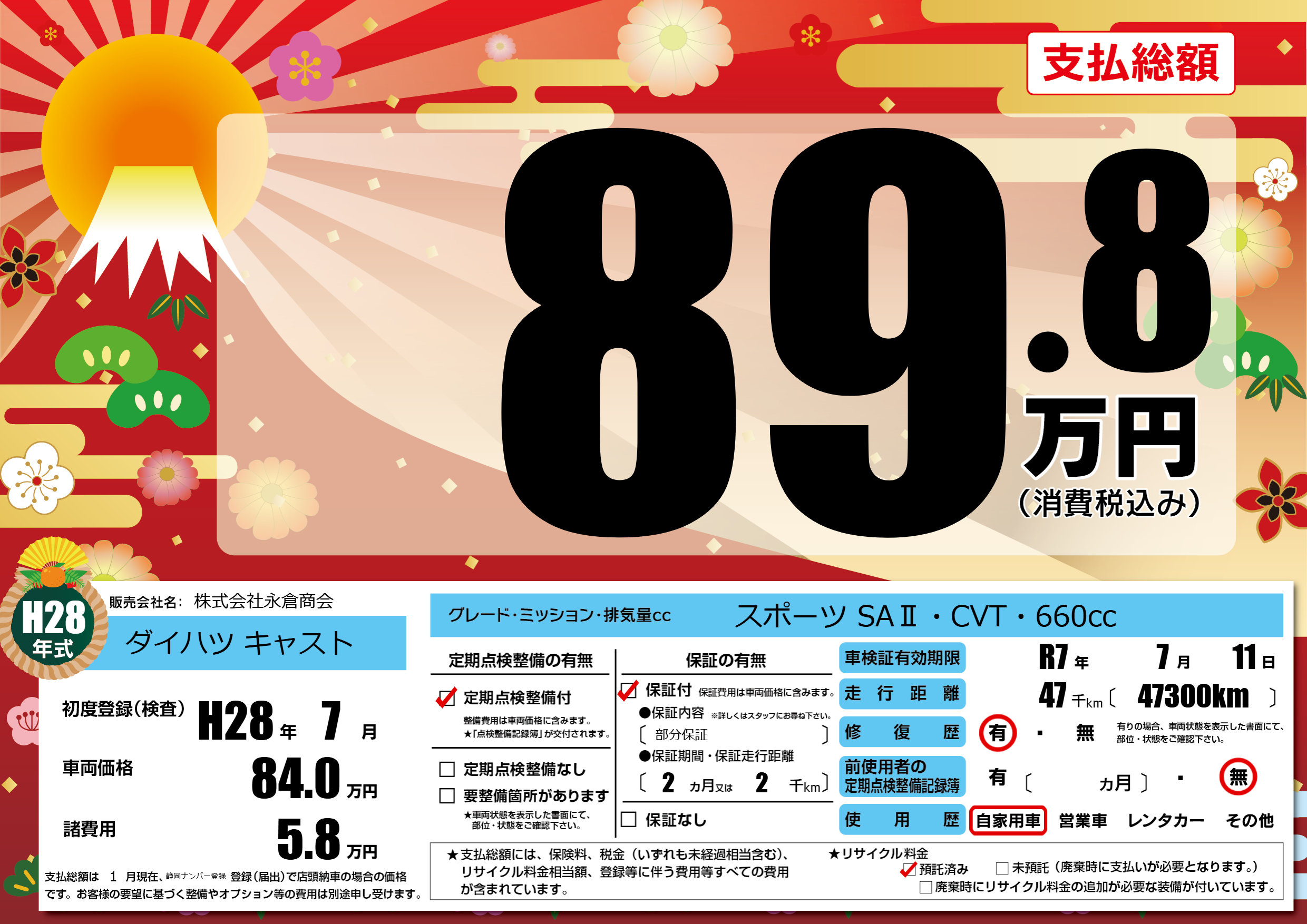 | 車名 | ダイハツ キャスト | グレード ミッション 排気量 |