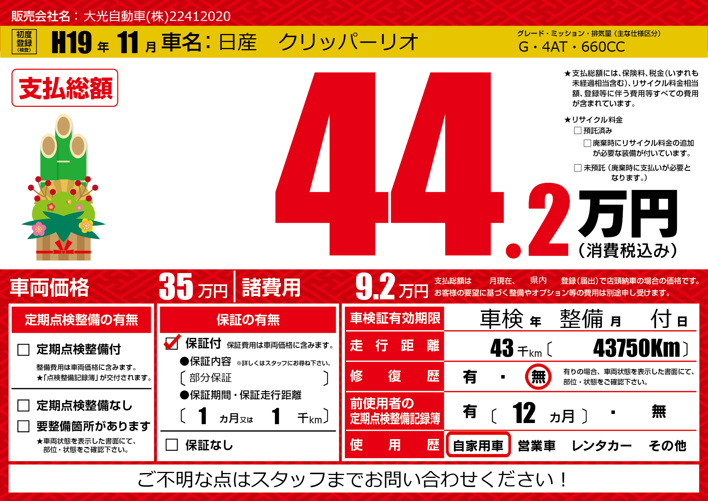 | 車名 | 日産 クリッパーリオ | グレード ミッション 排気量 |