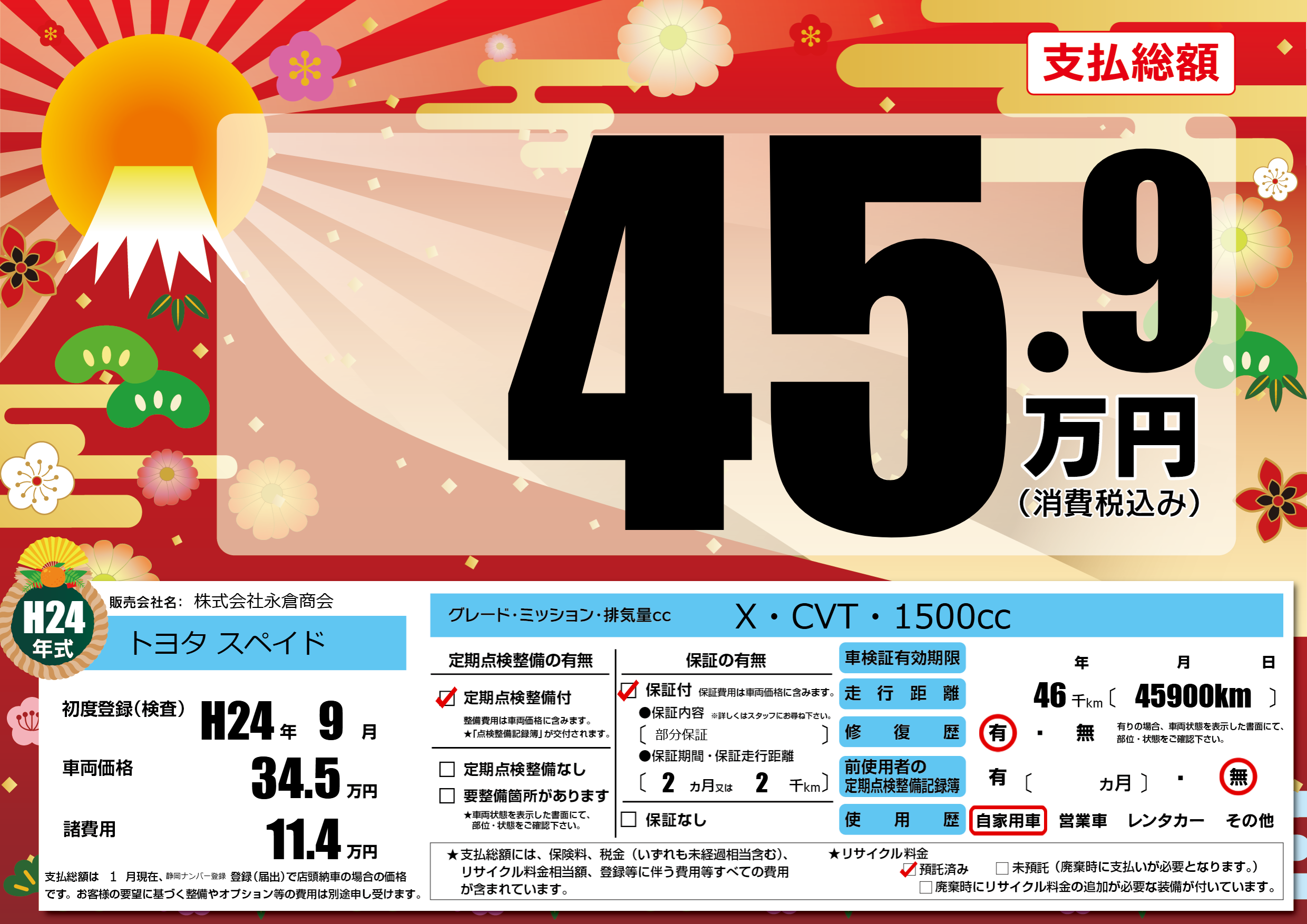 | 走行キロ | 4.6万km | 初年度登録 | H24年9月 |