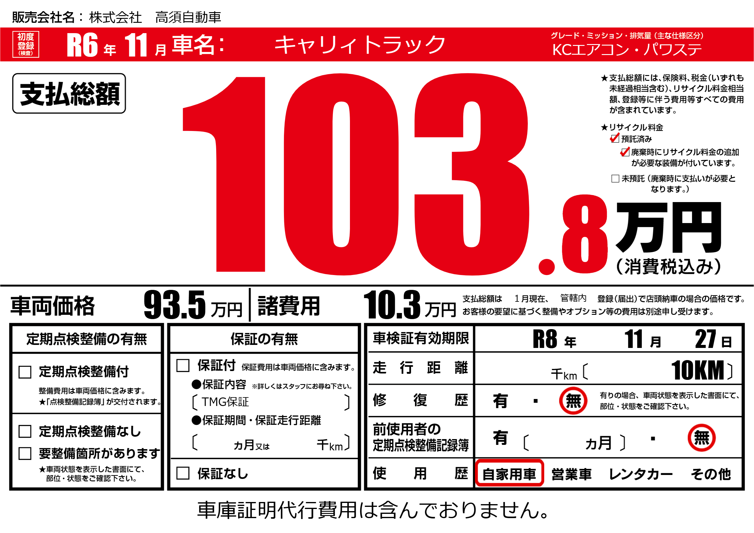 保証なし 保証内容(TMG保証) ---ヶ月または()千kmまで |
