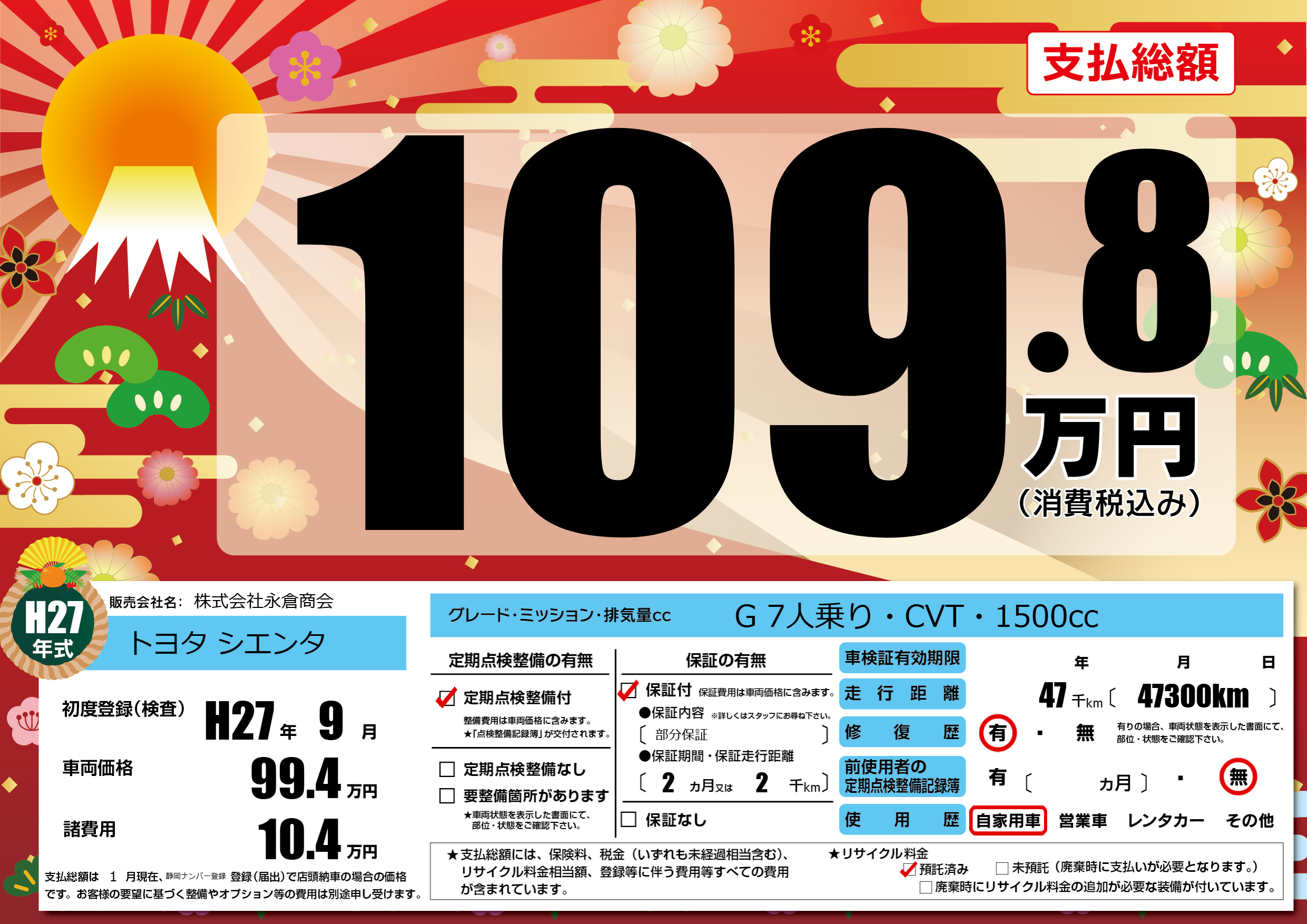 | 車名 | トヨタ シエンタ | グレード ミッション 排気量 |