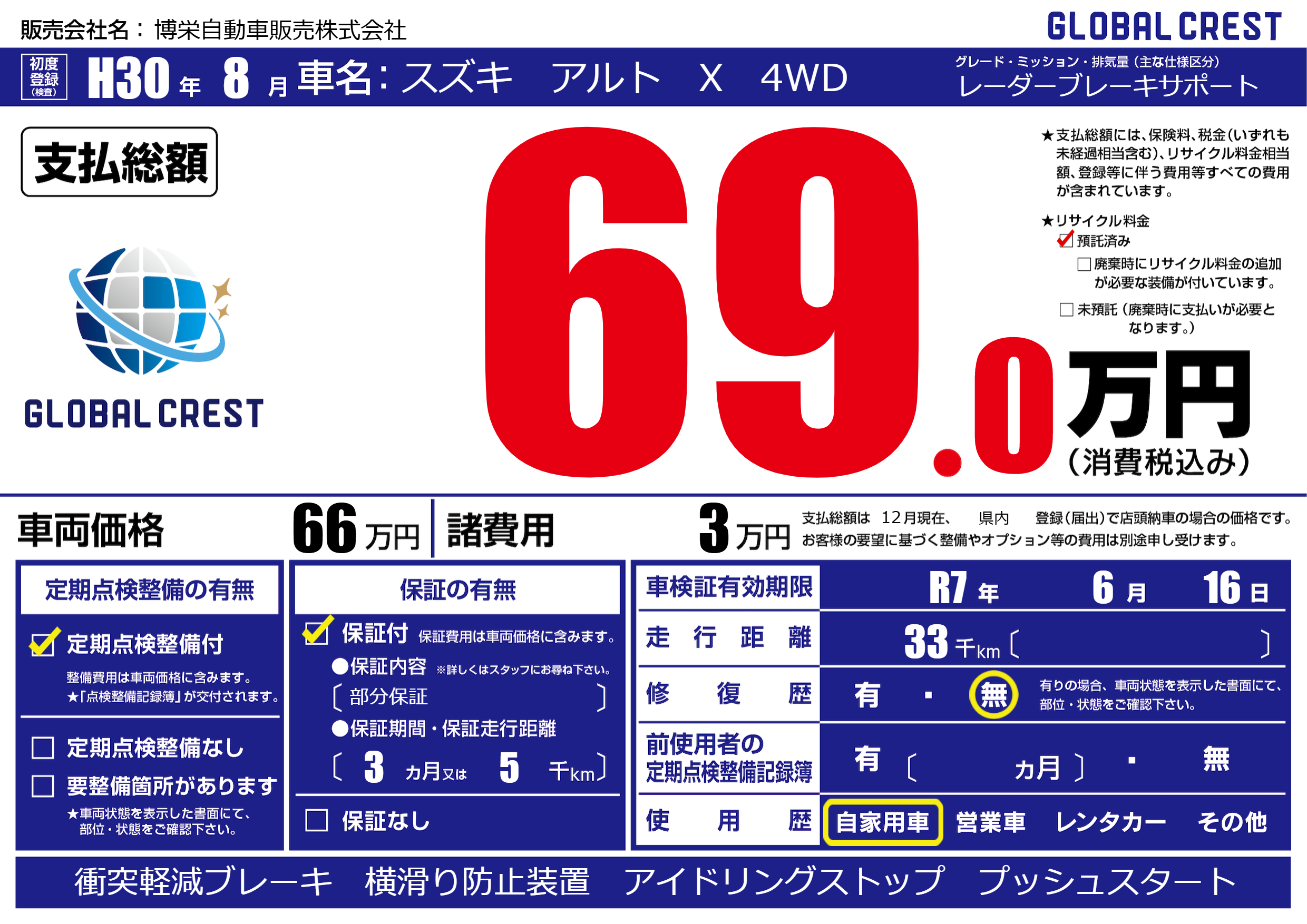 | 車名 | スズキ アルト X 4WD | グレード ミッション 排気量 |