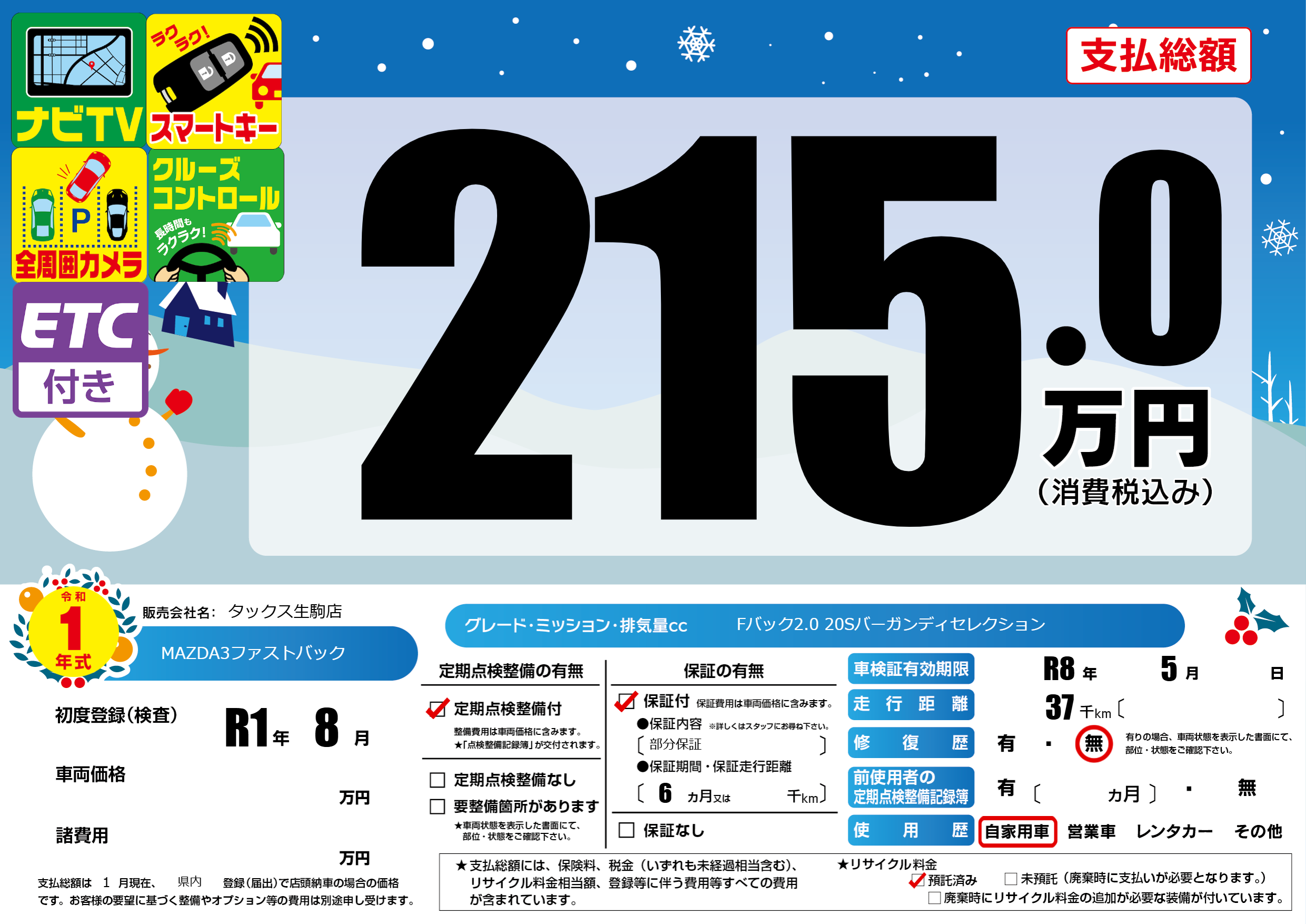 | 車名 | MAZDA3ファストバック | グレード ミッション 排気量 |