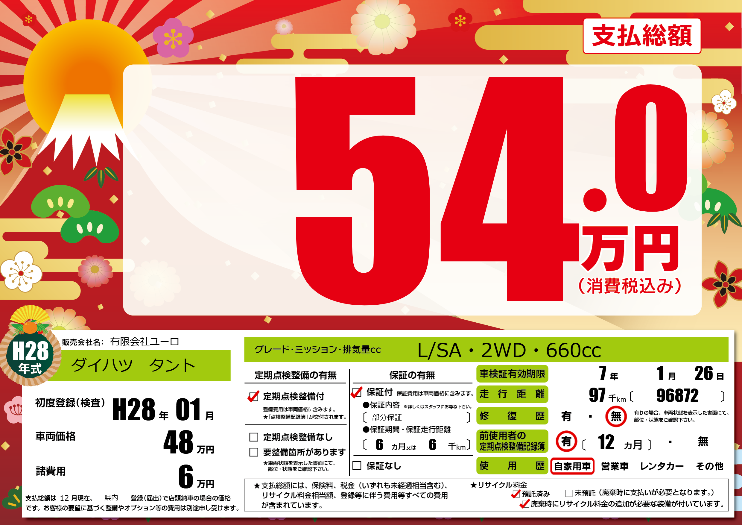 | 車名 | ダイハツ タント | グレード ミッション 排気量 |