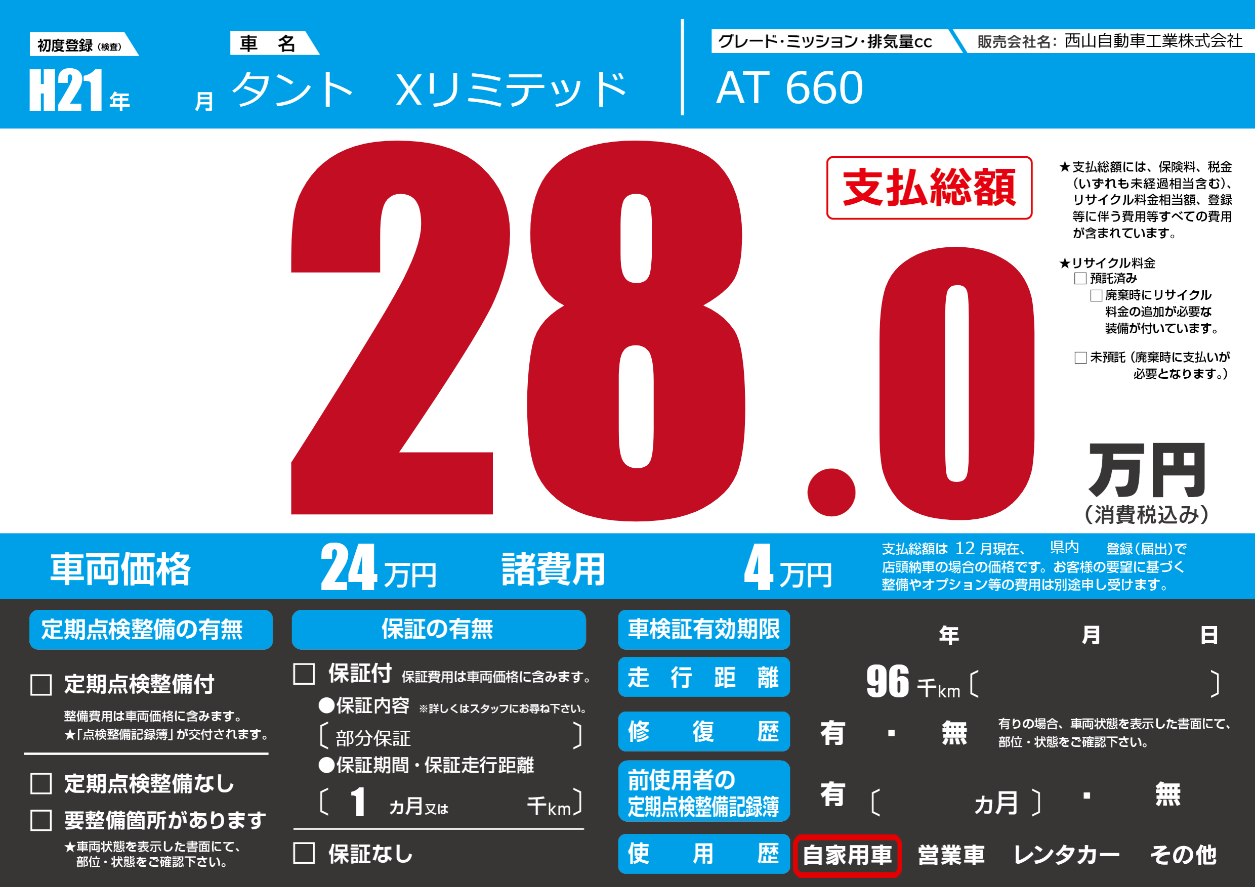 | 車名 | タント Xリミテッド | グレード ミッション 排気量 |
