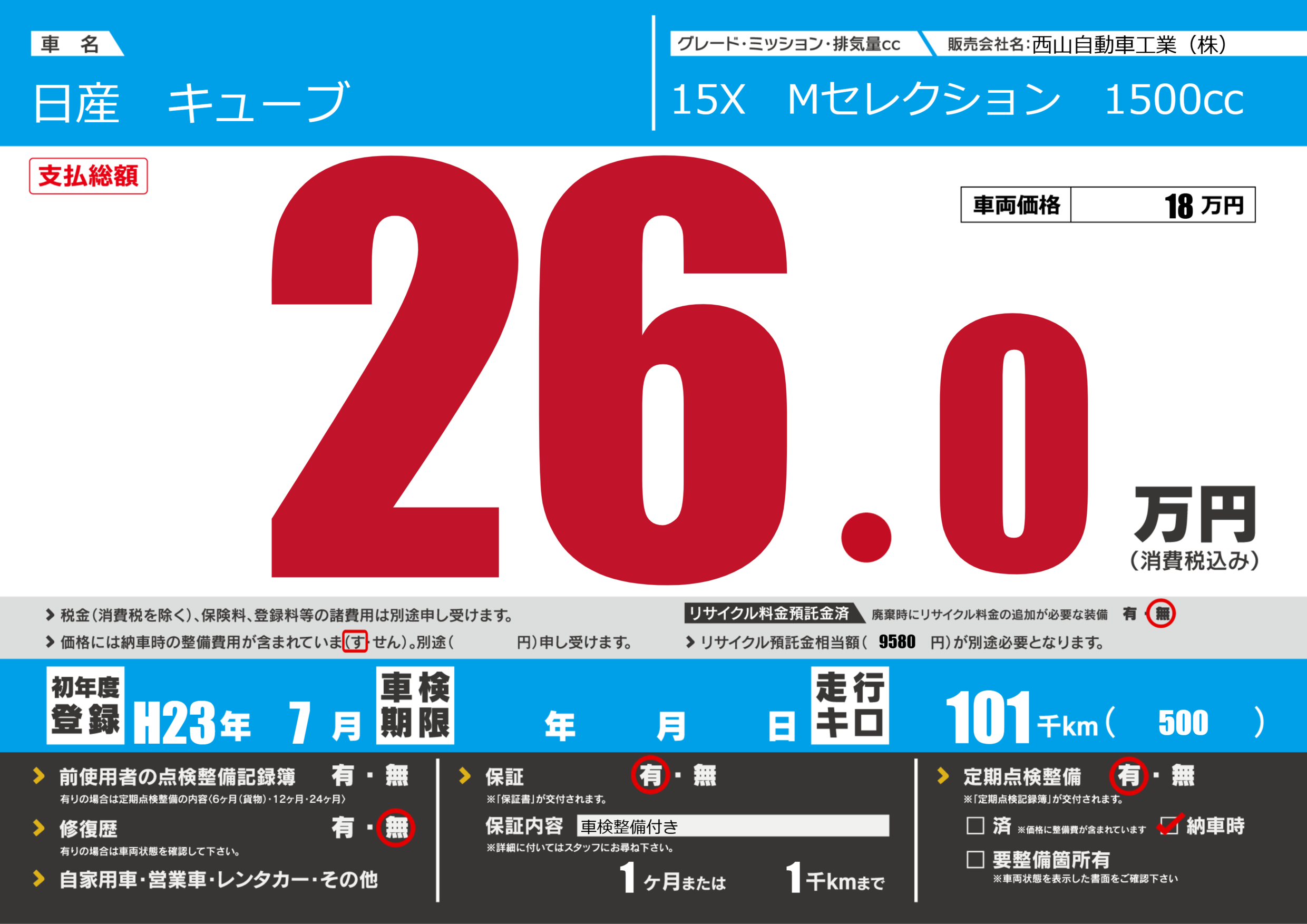 | 車名 | 日産 キューブ | グレード ミッション 排気量 |