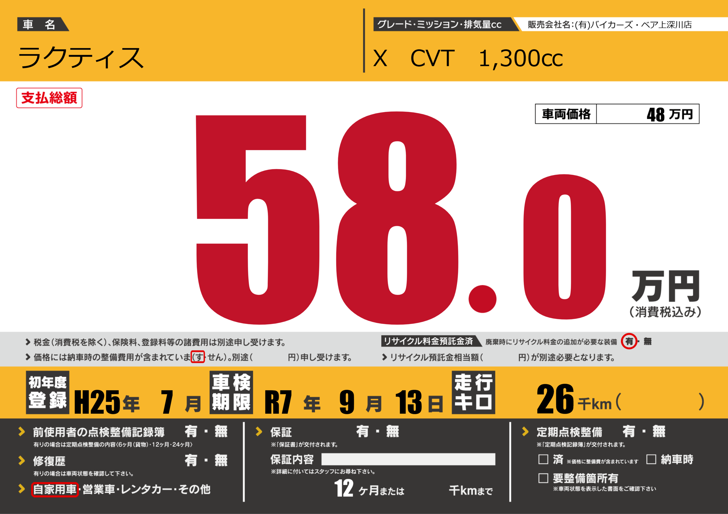 | 車名 | ラクティス | グレード ミッション 排気量 |