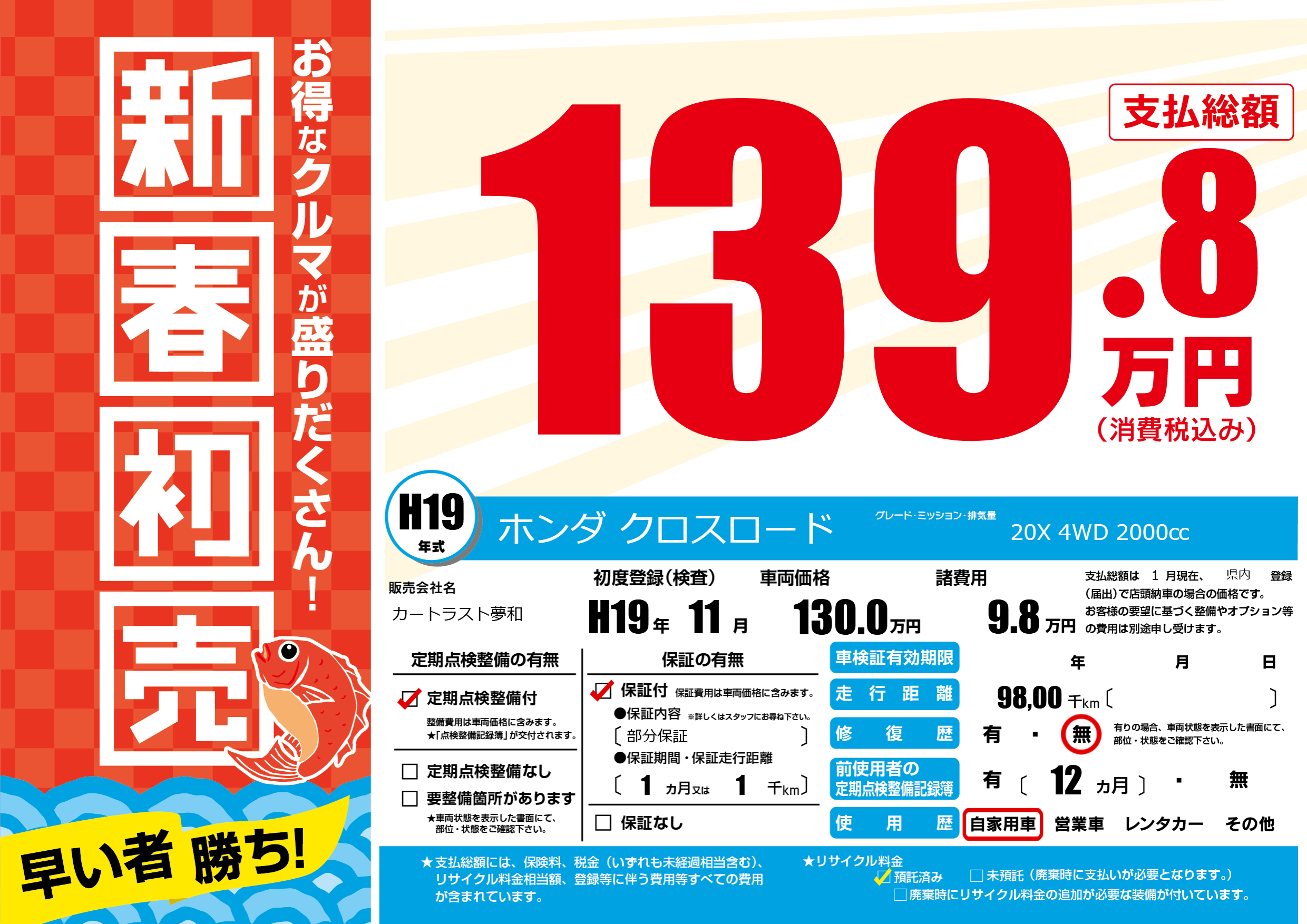 | 走行キロ | 9.8万km | 初年度登録 | H19年11月 |