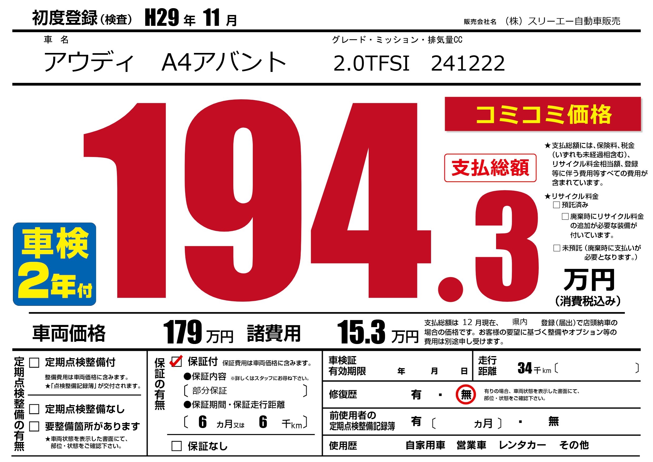 保証付き 保証内容(部分保証) 6ヶ月または(6)千kmまで |