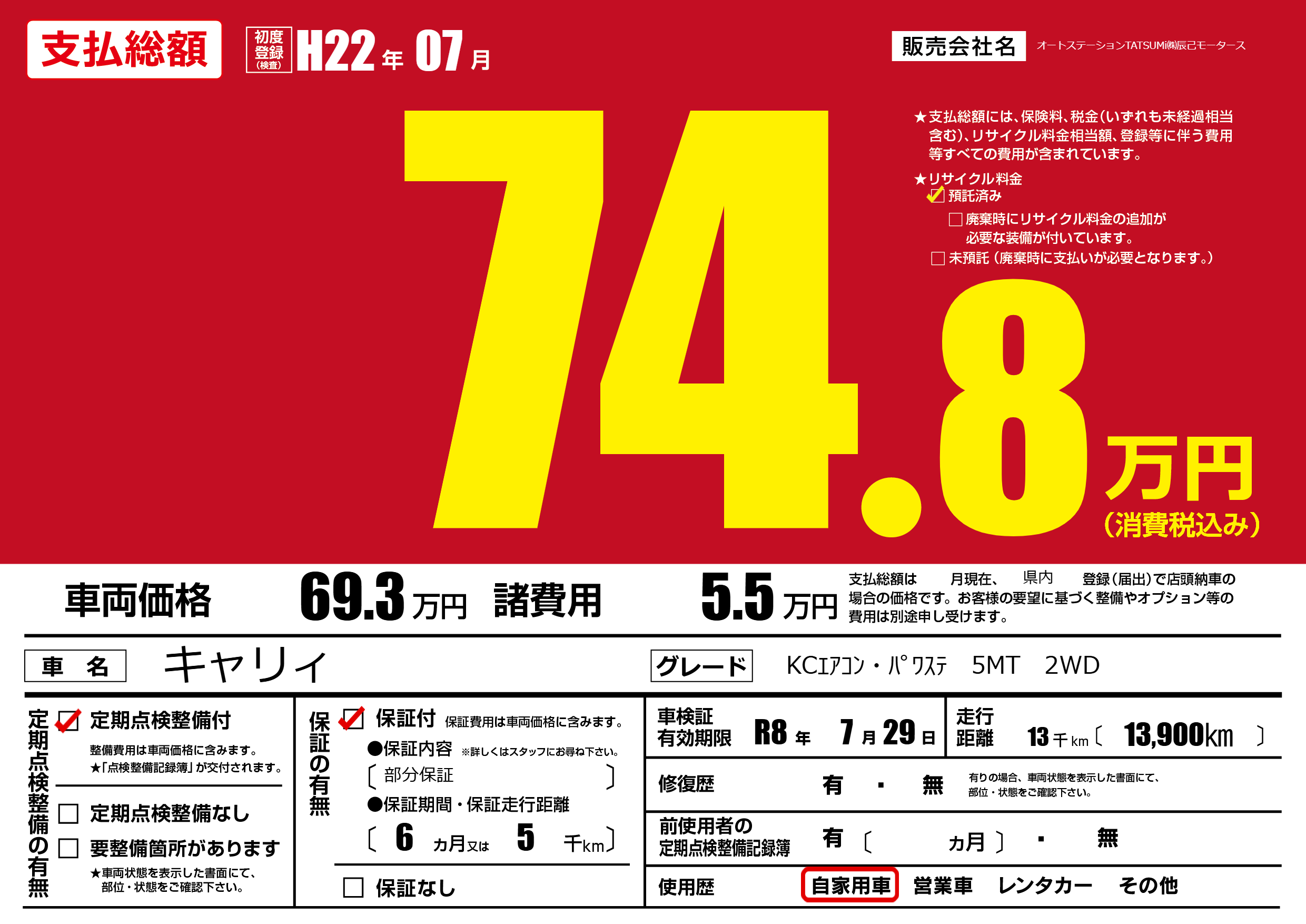 保証付き 保証内容(部分保証) 6ヶ月または(5)千kmまで |