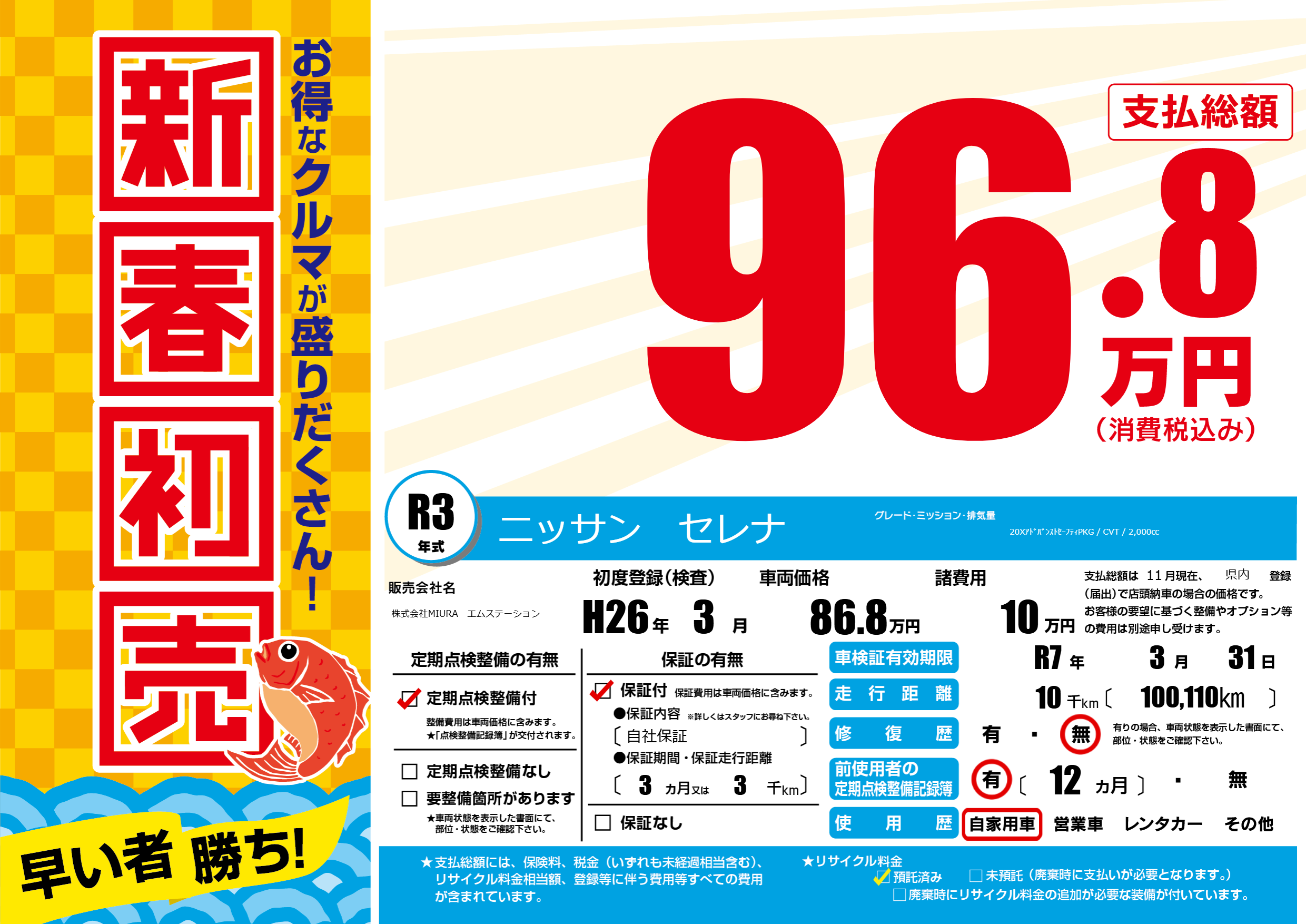 保証付き 保証内容(自社保証) 3ヶ月または(3)千kmまで |