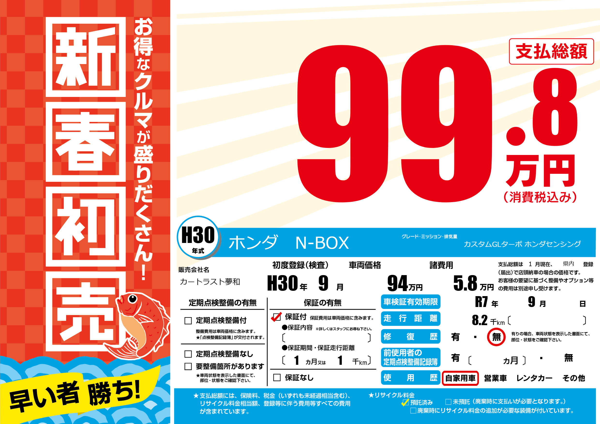| 走行キロ | 0.8万km | 初年度登録 | H30年9月 |
