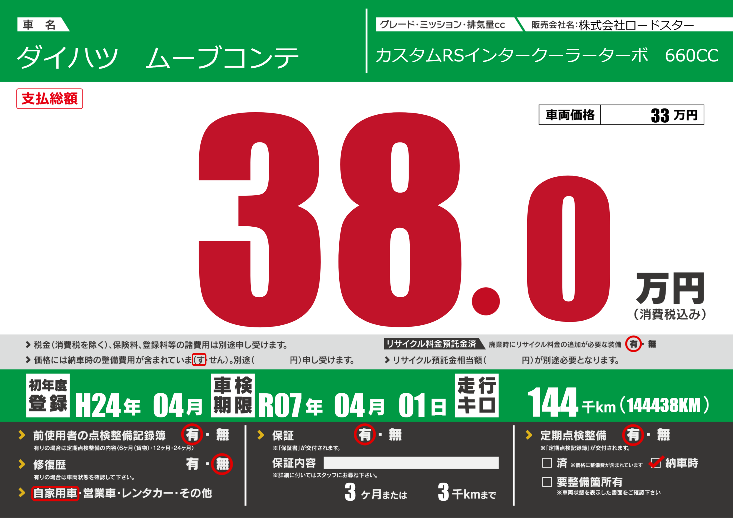 保証付き 保証内容(---) 3ヶ月または(3)千kmまで |