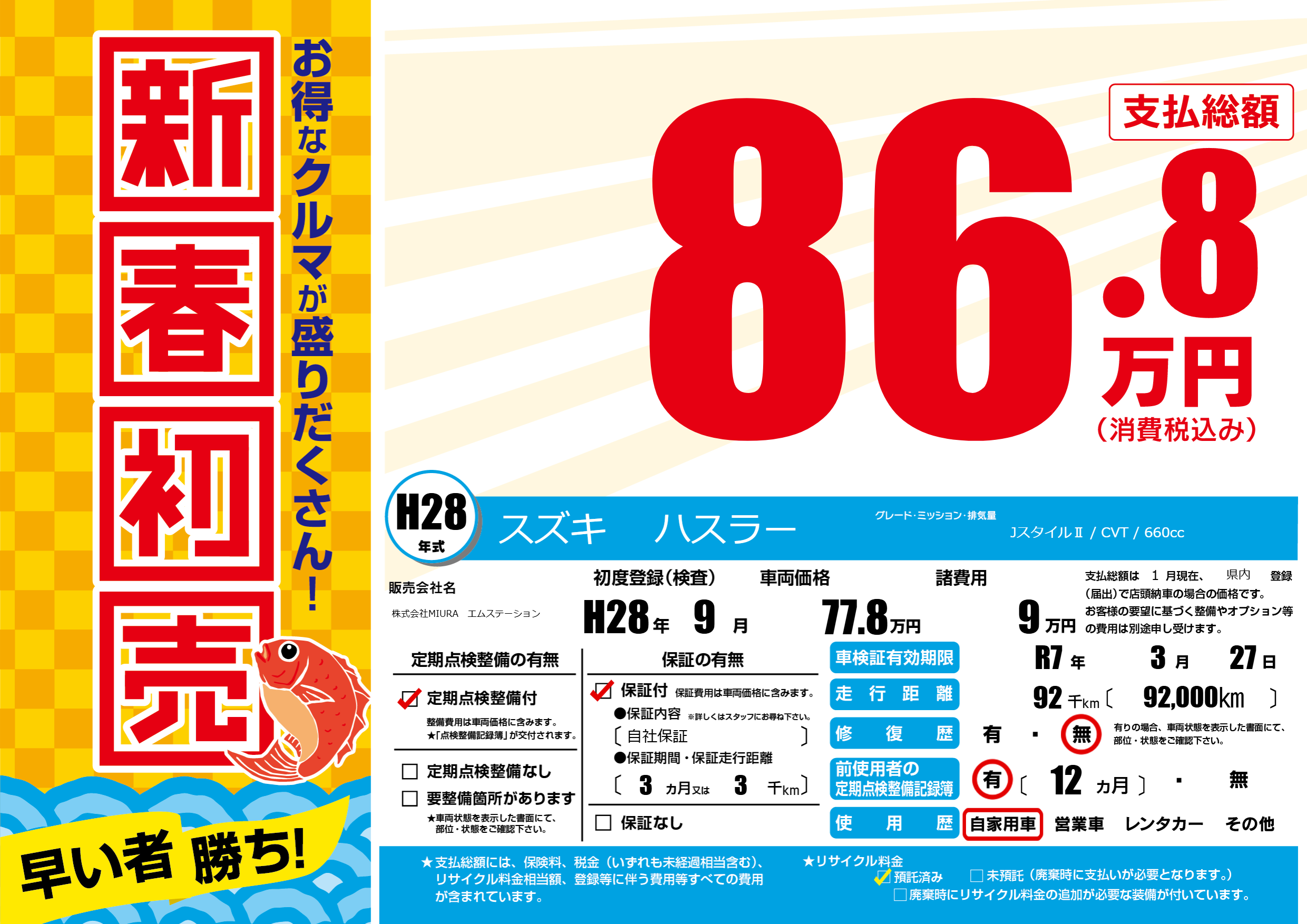 保証付き 保証内容(自社保証) 3ヶ月または(3)千kmまで |