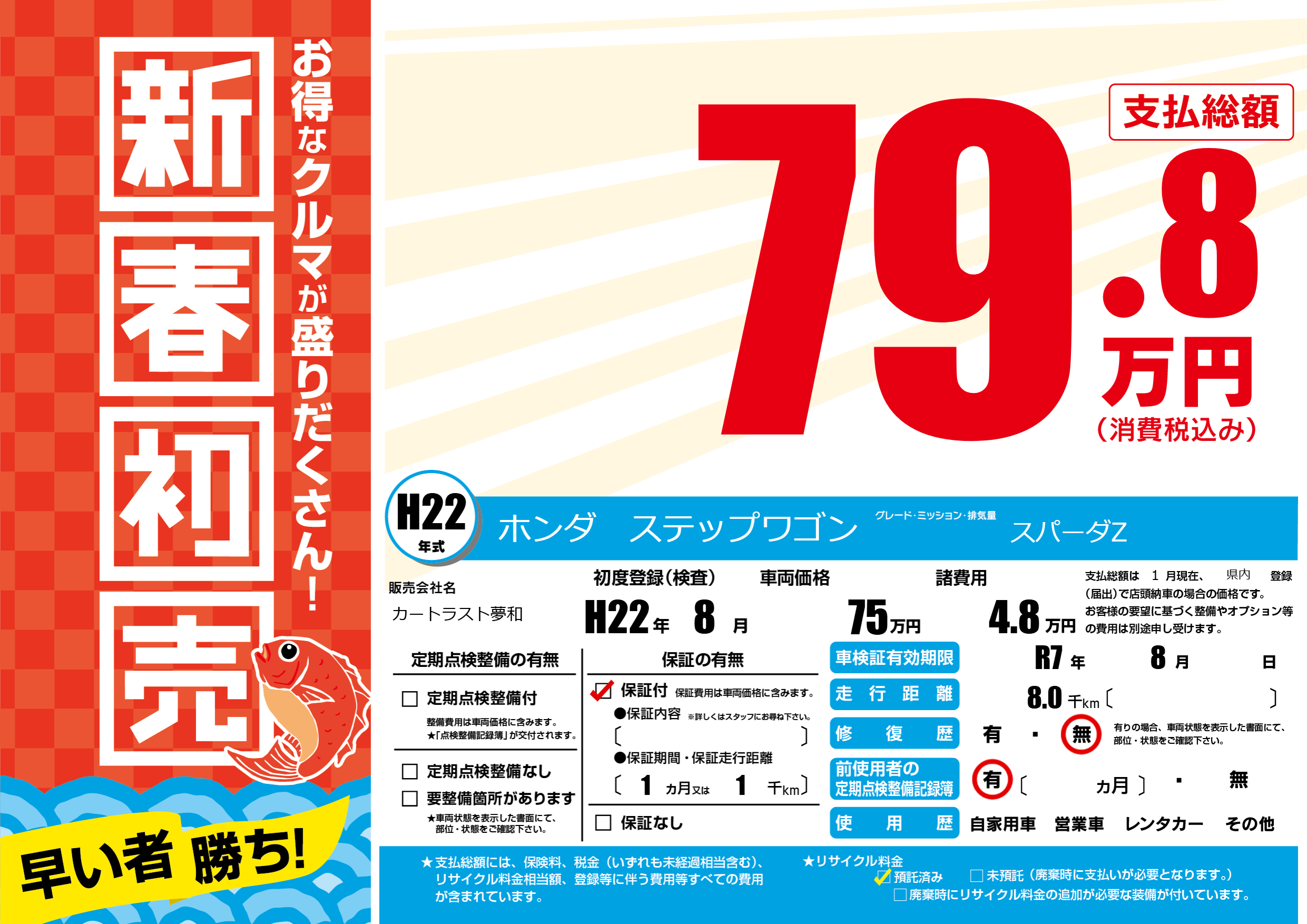 | 走行キロ | 0.8万km | 初年度登録 | H22年8月 |