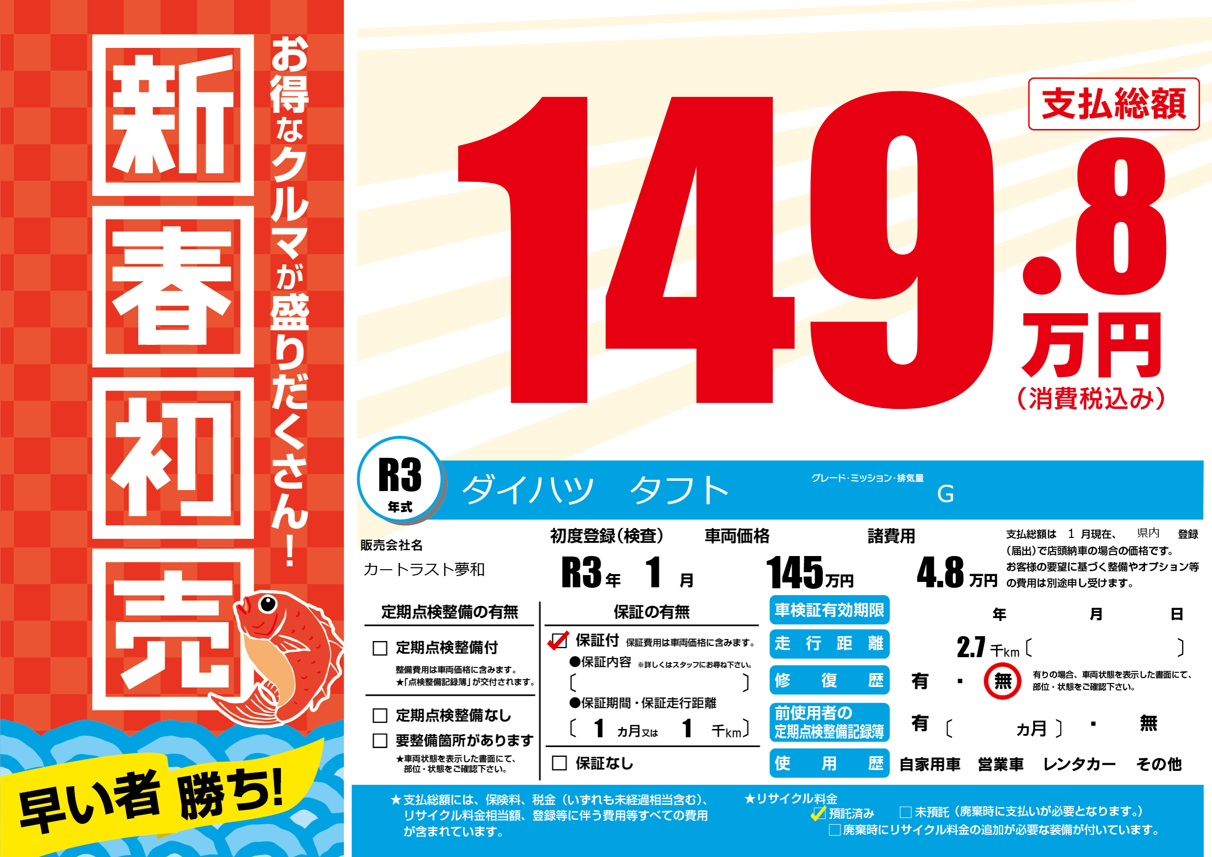 保証付き 保証内容(---) 1ヶ月または(1)千kmまで |