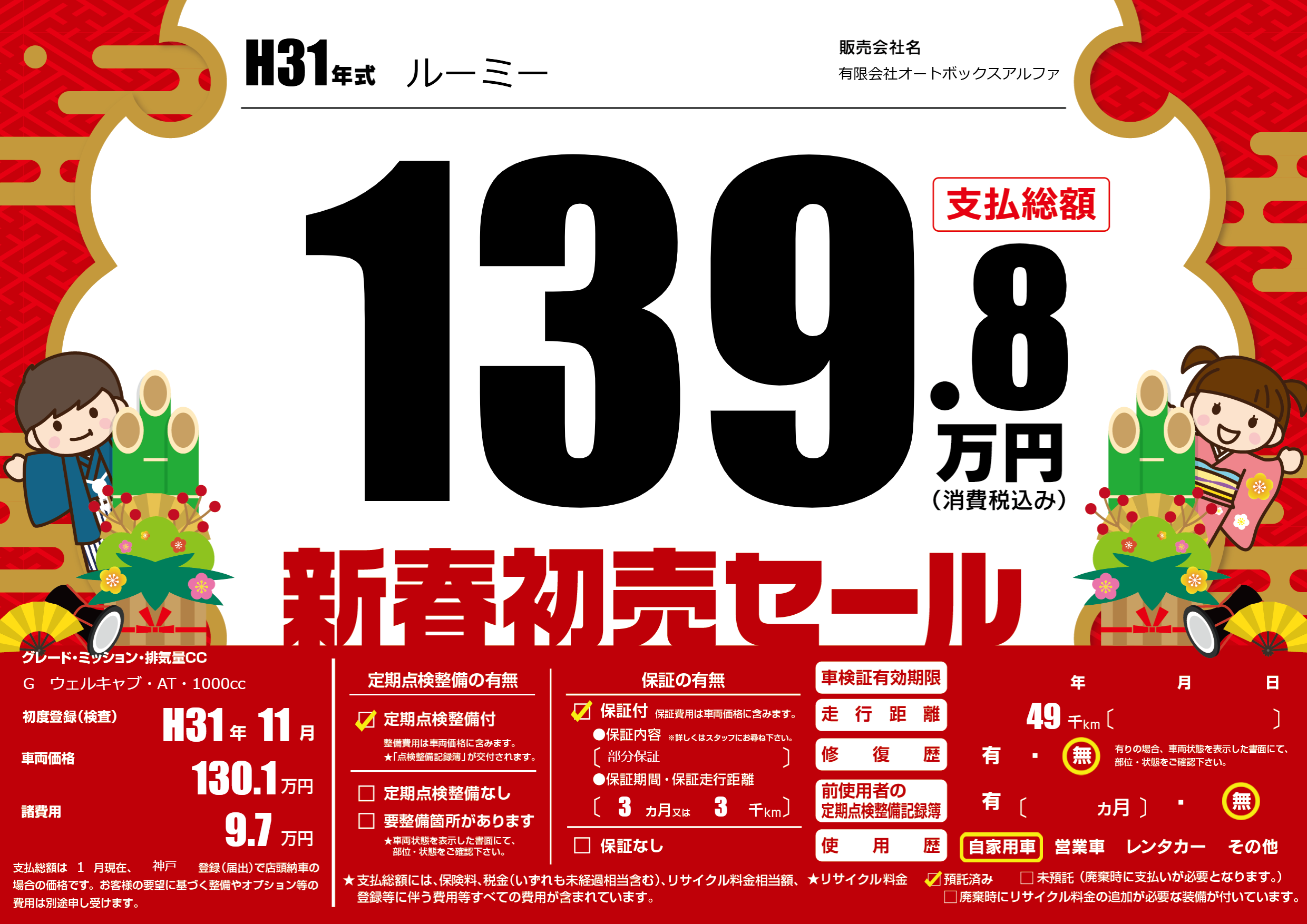 | 走行キロ | 4.9万km | 初年度登録 | H31年11月 |