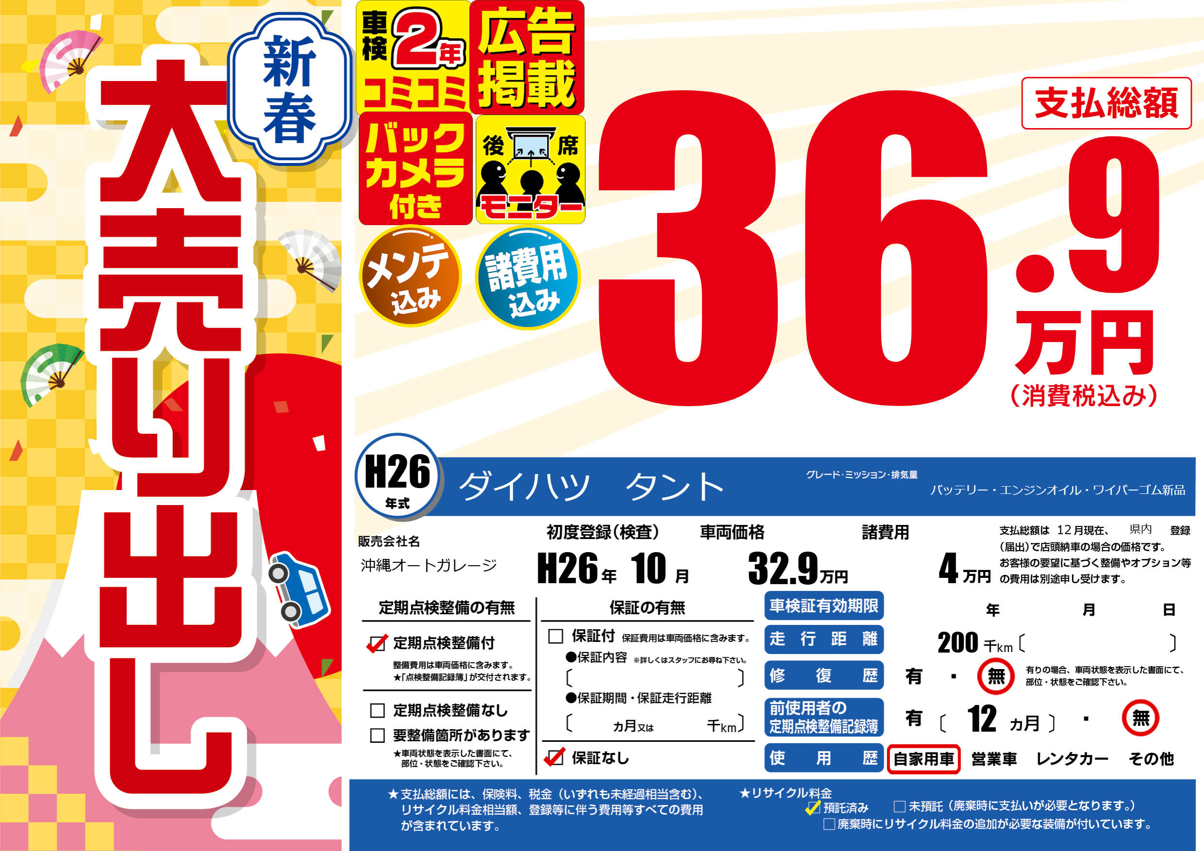| 車名 | ダイハツ タント | グレード ミッション 排気量 |