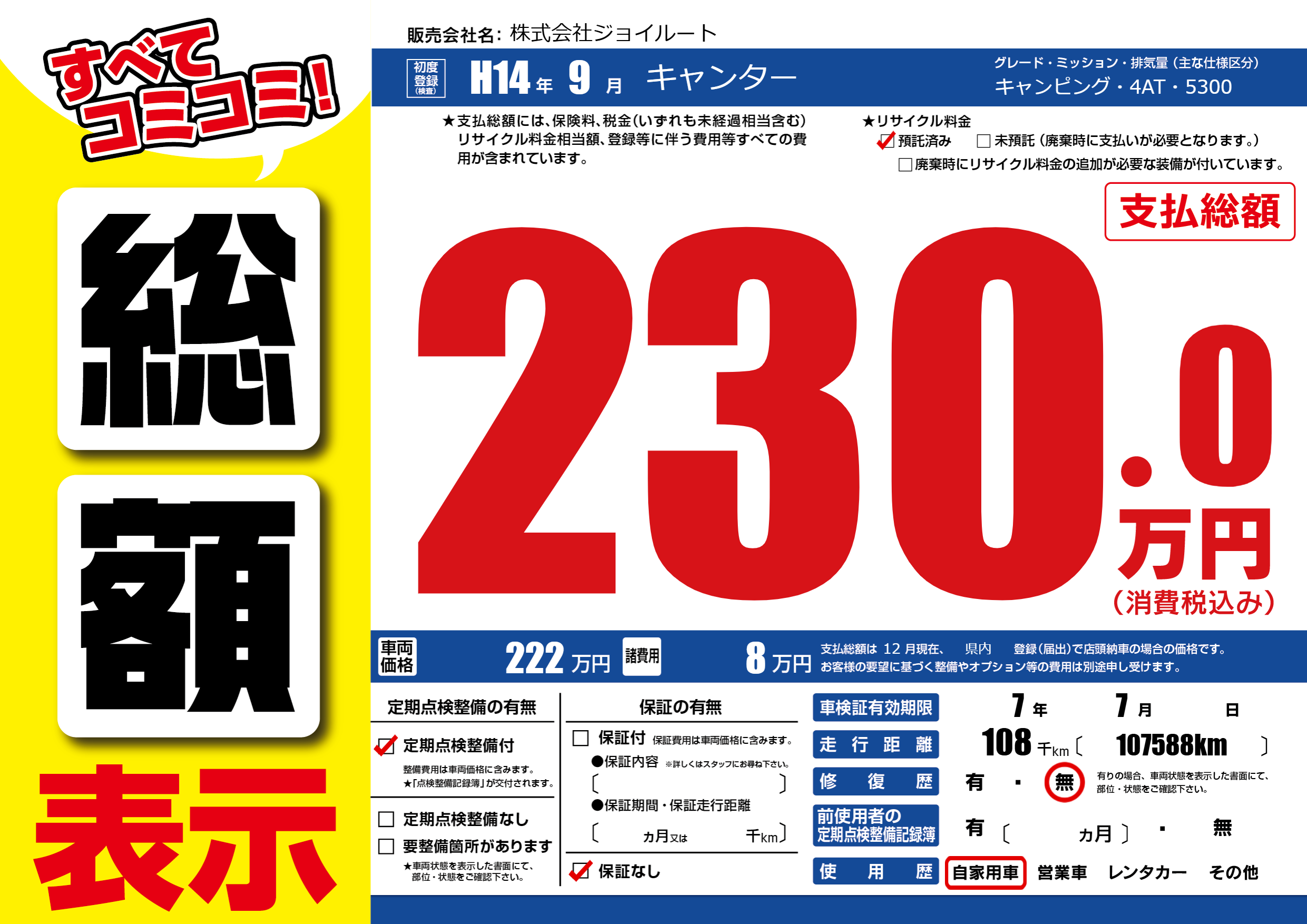 | 走行キロ | 10.8万km | 初年度登録 | H14年9月 |