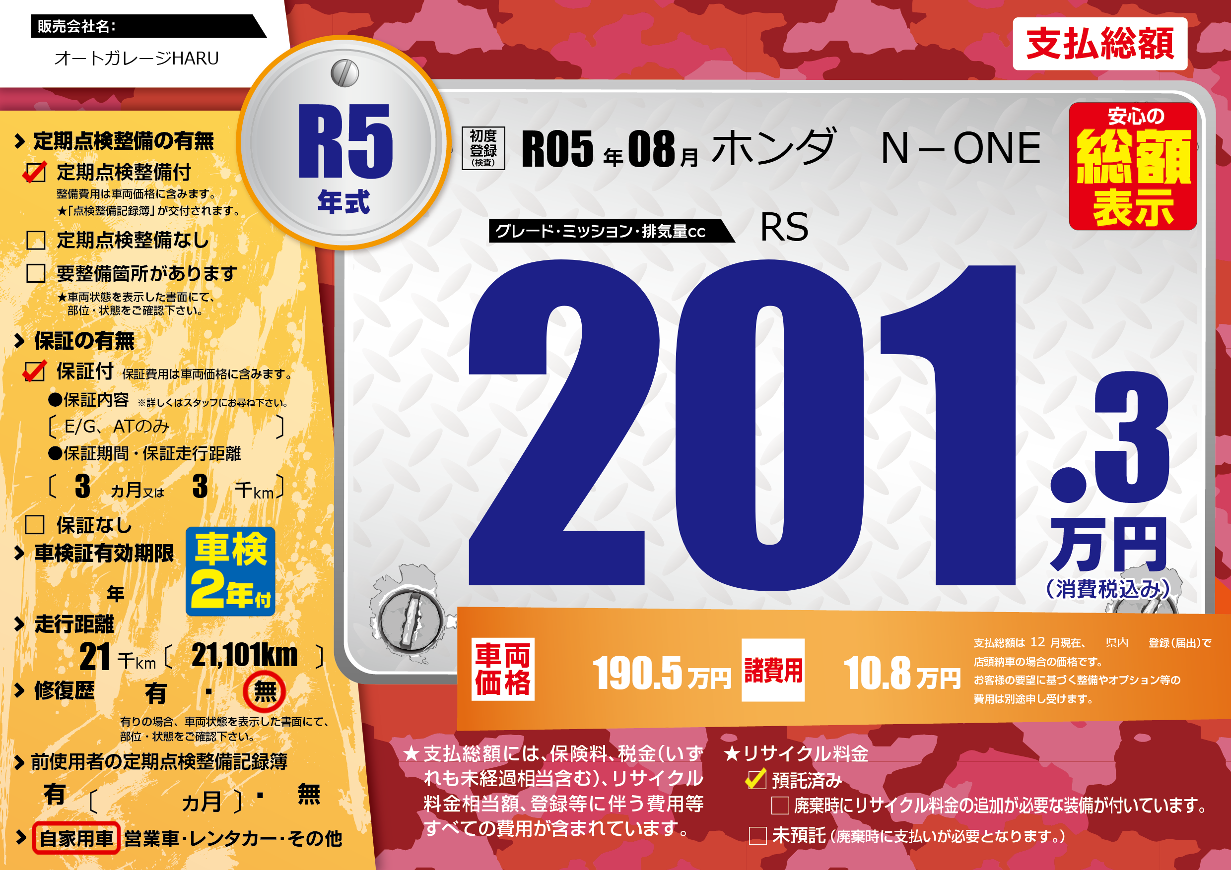 | 車名 | ホンダ N-ONE | グレード ミッション 排気量 |