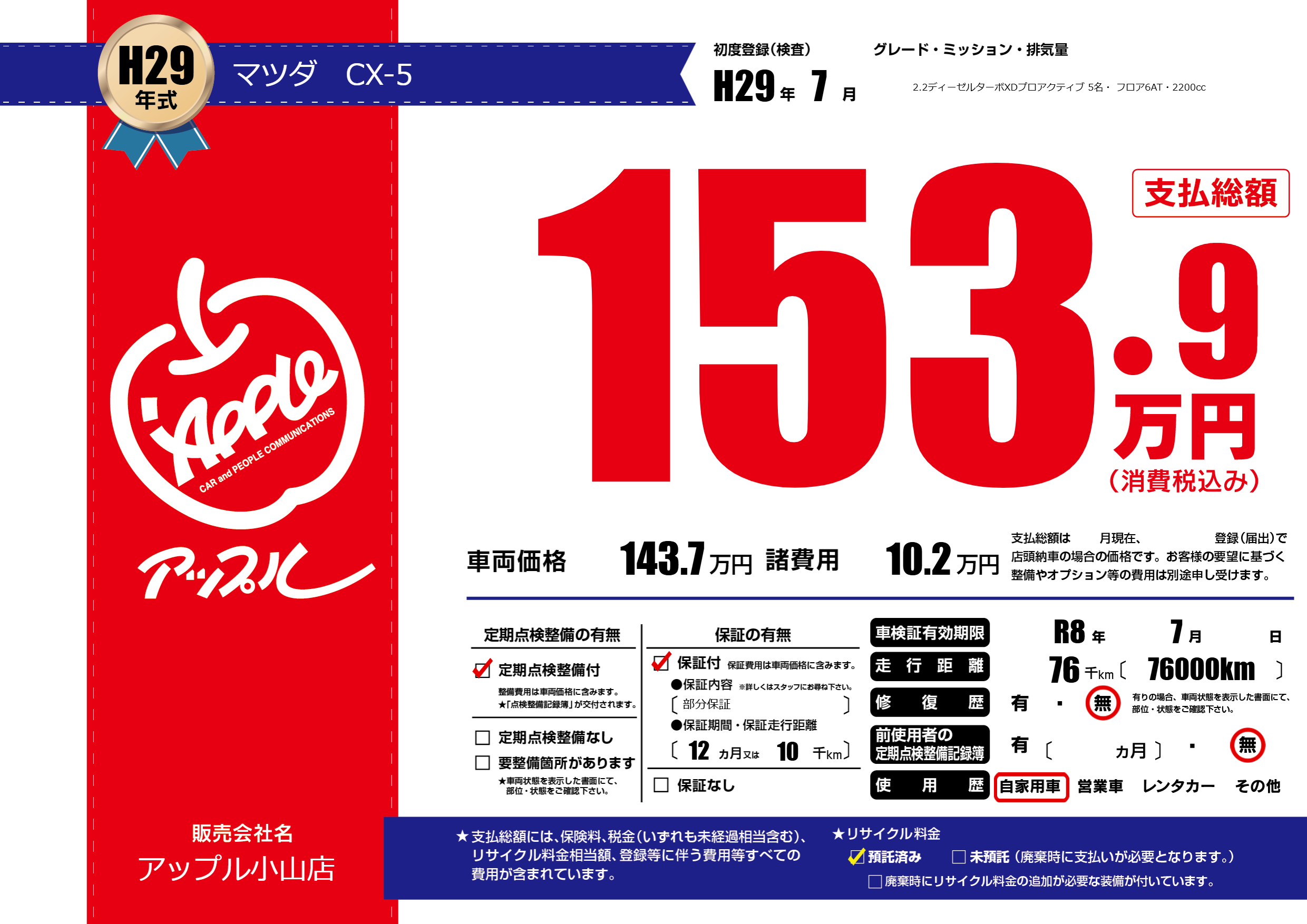 | 走行キロ | 7.6万km | 初年度登録 | H29年7月 |